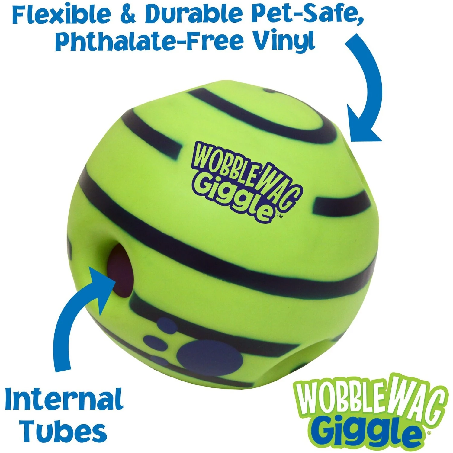 Wobble Wag Giggle Ball Dog Toy is an interactive play ball that engages your dog’s natural curiosity and instinct to play, with super funny sounds, and unique colors and motion designed to mimic human laughter and joy. Three tubes inside the ball let out sounds when it rolls around, all without the need for batteries. Your dog will have tons of fun whether you’re around or not, and the sense of accomplishment she will feel when she catches and shakes it will leave her happy and proud.