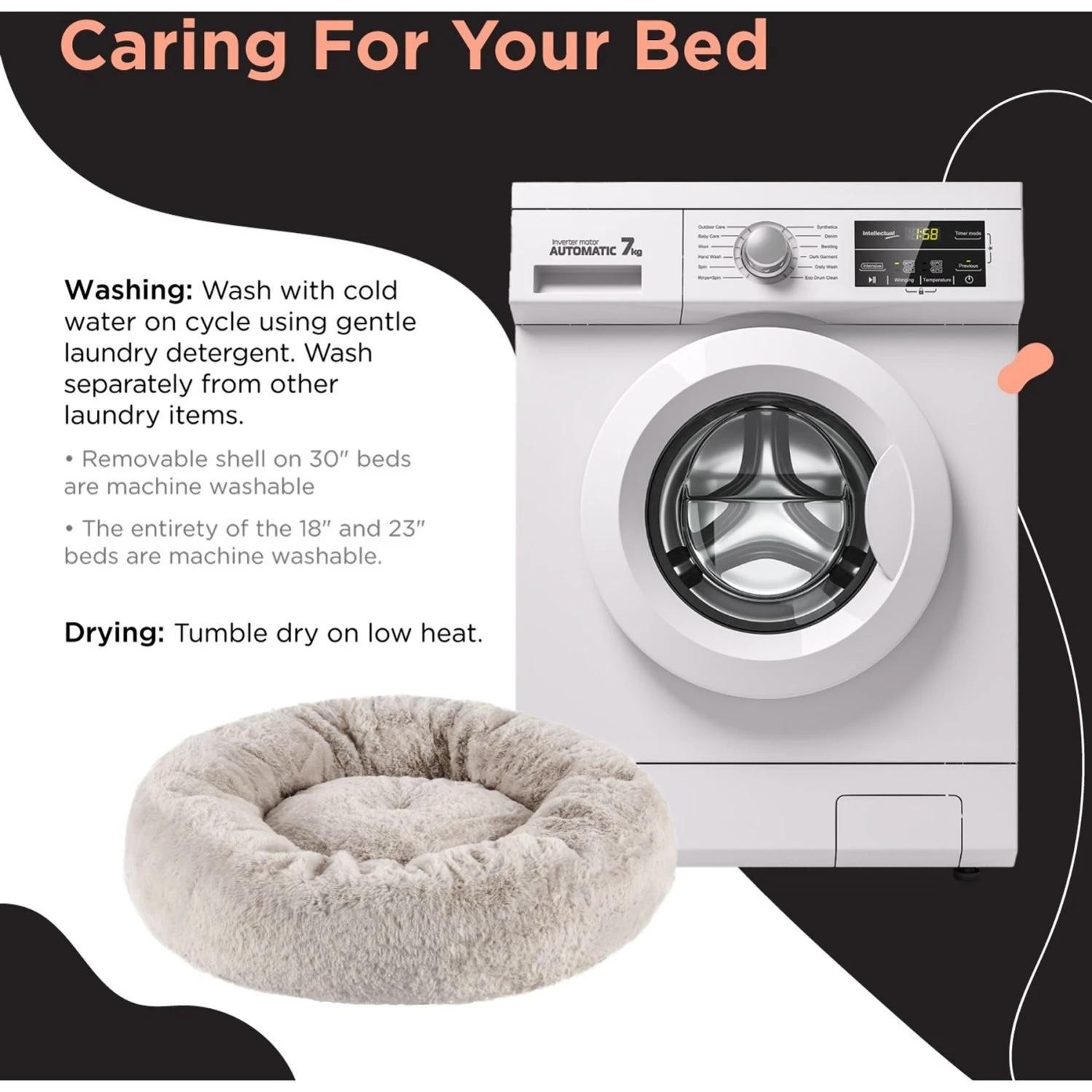 Removable shells available on size M-XL beds are machine washable. The entirety of the small-sized bed is machine washable. (Do not leave bed to air dry, as this will lead to tangling and matting of the faux fur).