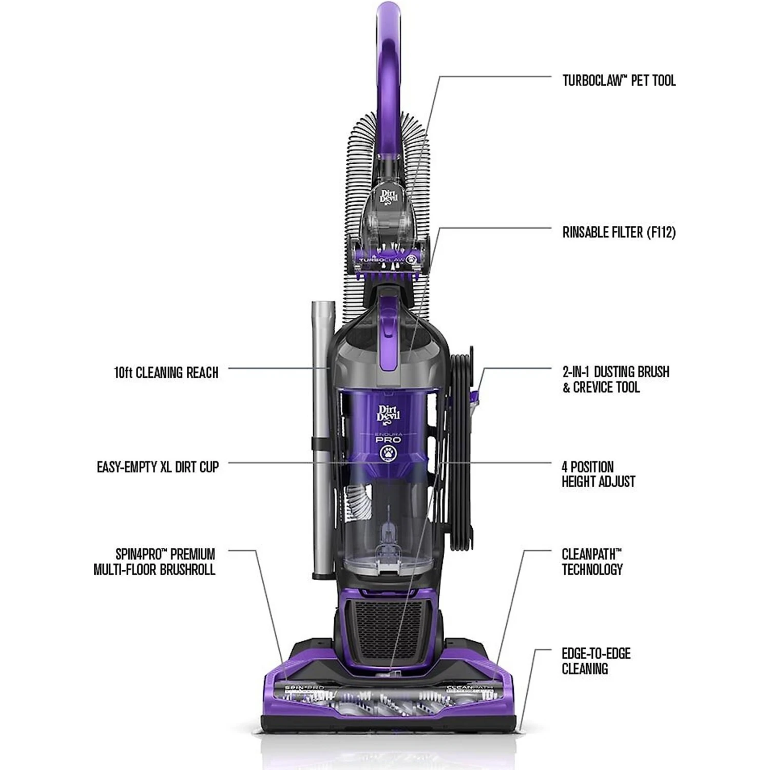 Help ensure your floors are free of pet hair with the Dirt Devil Endura Pro Upright Vacuum Cleaner. This vacuum cleaner is equipped with a filter that promotes a powerful suction and helps lessen unwanted pet smells. It also features a brushroll and four levels of height to help remove debris and fur from both carpet and hard floors. Its dirt cup allows you to empty debris by simply pressing a button, and its extra cleaning tools can be stored on the vacuum itself. Plus, this vacuum comes fully assembled so that you can spend less time fiddling with tools and more quality time with your furry family member!
