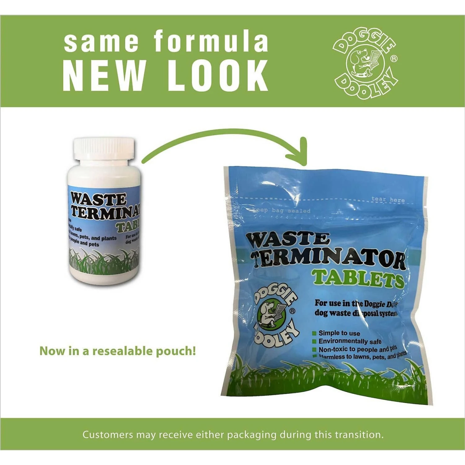 The Doggie Dooley Septic Style Dog Waste Disposal System and Doggie Dooley Waste Terminator Tablets are an efficient and hands-free way to clean up pet messes in the yard. An enclosed galvanized steel tank with a large, built-in overflow tube is easily opened when the polyethylene plastic lid is pressed with your foot. The tablets contain billions of helpful bacteria per tablet that work to break down pet waste from solid to liquid form. Itโs non-toxic, harmless and helps control pet waste odors.