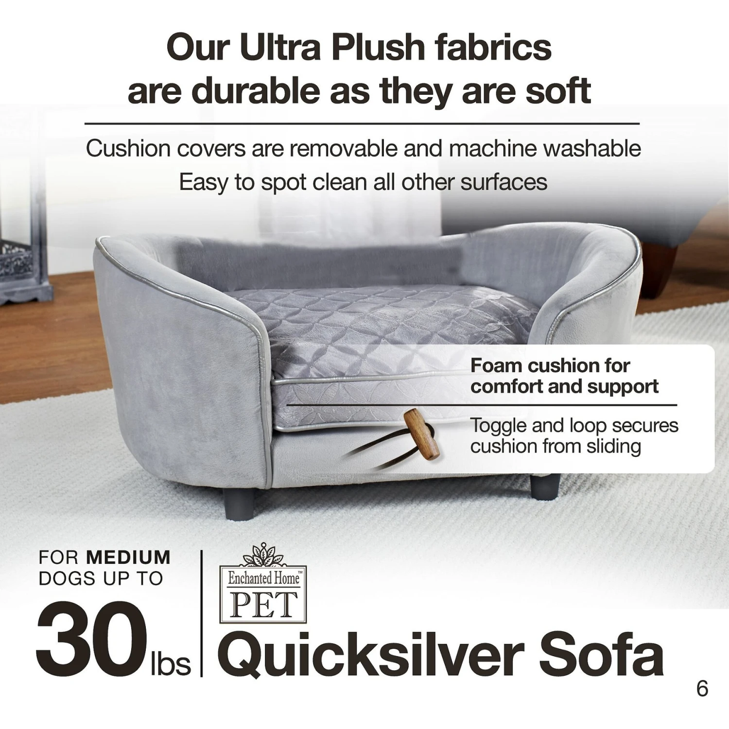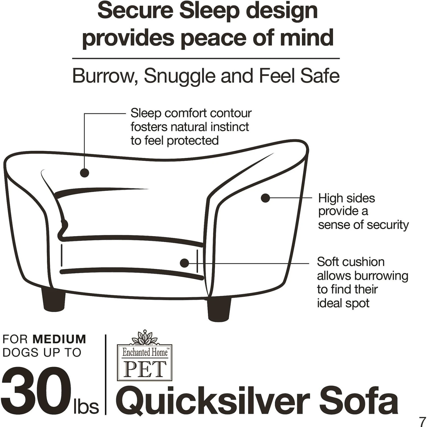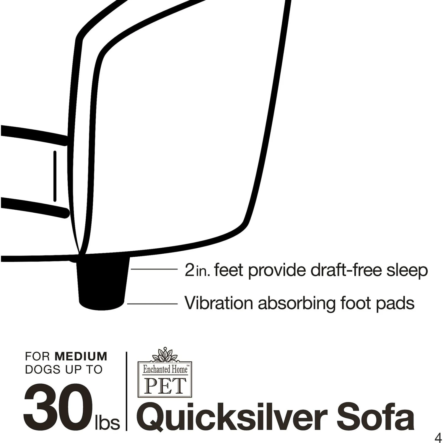 Even the most mercurial buddies will melt comfortably into the Quicksilver Pet Sofa. Featuring a high-loft cushion, plush fabric and supportive sides, this luxurious bed surrounds your best friend in comfort and style. Itโs got a removable cushion with a washable cover, raised feet to lift your pet off the ground and a pocket to hold lots of toys. With durable, furniture-grade construction thatโll keep it looking great for ages, this comfy pet couch can support pets to up to 30 pounds.