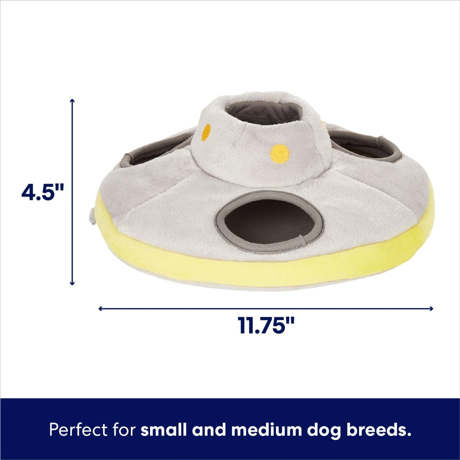 Let the games begin! This plush puzzle toy from Frisco by Chewy comes with a soft flying saucer and six squeaky Martians for some interplanetary hide-and-seek fun. Stuff them in the saucer and watch your pup pull them out one by one. Puzzle games are a great way to prevent boredom, provide daily mental stimulation, and bond with your pooch. The squeakers will really get your dogโs attention, and the soft, snuggly textures are perfect for nap time, too. Plus, there are two types of Martians for added fun.