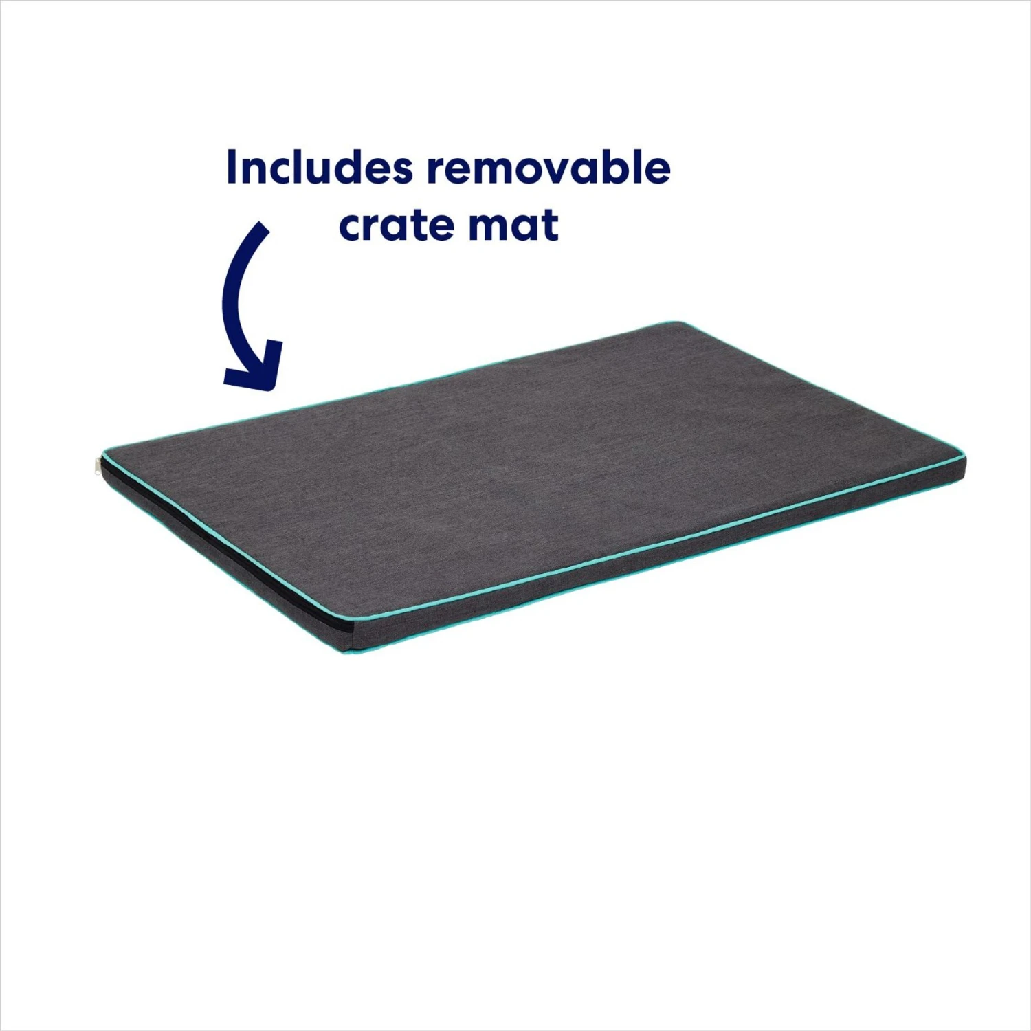 Give your dog a well-designed space just for them with this heavy-duty wire crate from Frisco by Chewy. You get everything you need to create a special spot just for themโthe crate, a comfy mat, and a base pan. Itโs designed to fit and work well in tighter spaces, with dual sliding doors on the front and side that take up less space than traditional swinging doors. Setting it up and taking it down is quick and easy, with no tools requiredโjust unfold it and lock the panels in place to provide your pet the private space they need. The enhanced locking system simplifies the process of securing your dogโs spot down to one simple step to secure all three locks. Plus, teal accents give it a stylish appearance to complement the convenient functionality.