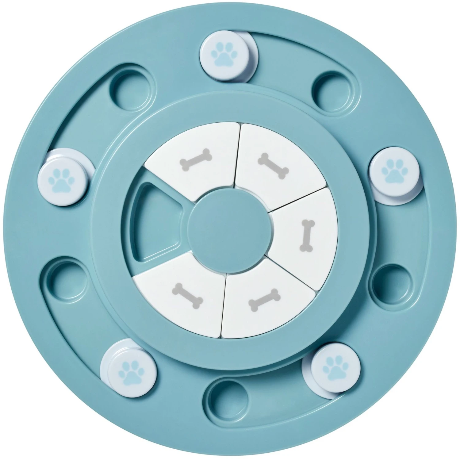 Do not allow your dog to chew or pick up the puzzle. Supervise your pet when using toy as small parts can present a choking hazard or cause internal blockage. Clean and store when not in use. Discontinue use if the toy is damaged or if parts become dislodged. No toy is indestructible. For indoor use only. For adult pet use only, not intended for puppies. Keep out of reach of children.