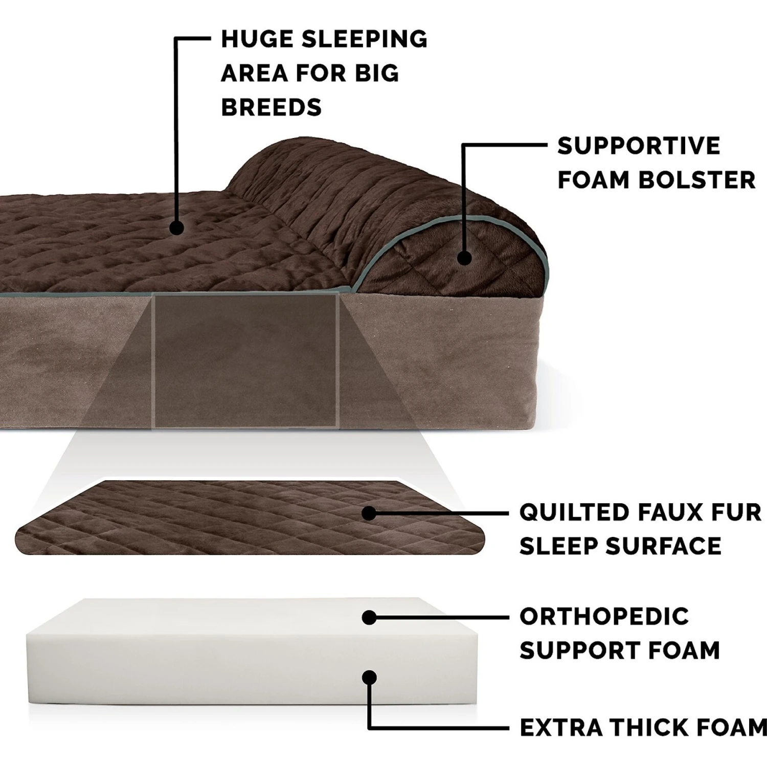 With the Quilted Faux Fur & Velvet Goliath Chaise dog bed by FurHaven, your large dog can truly sail off to dreamland in luxury. Specially tailored for your large breed dog, this chaise-style bed won’t let your big guy down like other beds might—that’s because the Goliath is built to be a comfortable, supportive pillow for dogs up to 300 pounds. It’s got 7-inches of medical-grade orthopedic foam beneath its ultra-plush faux fur exterior, building it for big comfort from the inside and out. The irresistible foam relieves aching joints, prevents painful pressure points, and bolsters your pet’s neck and spine as he happily snoozes the hours away. Plus, the cushy sleeping surface feels oh-so-nice on delicate paws and noses! With three varied sizes and two distinct color options, you can choose the Goliath that’s paw-fect for your furbaby and your home’s individual style.