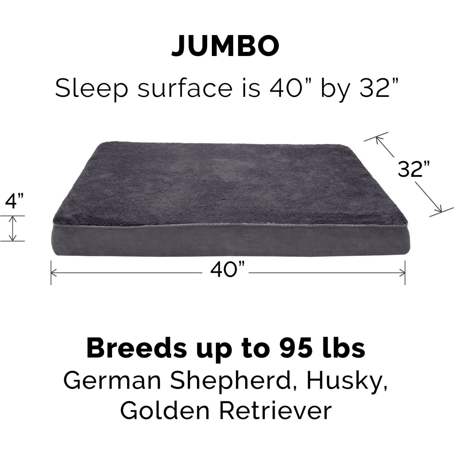 The FurHaven Terry & Suede Memory Foam Pet Bed gives your pet an ultra-comfortable bed that he might just love more than yours. Featuring a memory foam core thatโs laminated to medical-grade polyurethane, it works with your dogโs weight to cradle his body and provide relief to painful muscles and jointsโmaking it the perfect retreat after a long day at the park, or for loyal companions that could use the extra support. The result is a longer, more restful sleep that can actually improve his health and energy, with a super-snuggly soft terry fleece exterior and dyed-to-match suedine gusset that will feel like a warm embrace. And the design is paw-fect for older or disabled pets since itโs easy to step right onto!