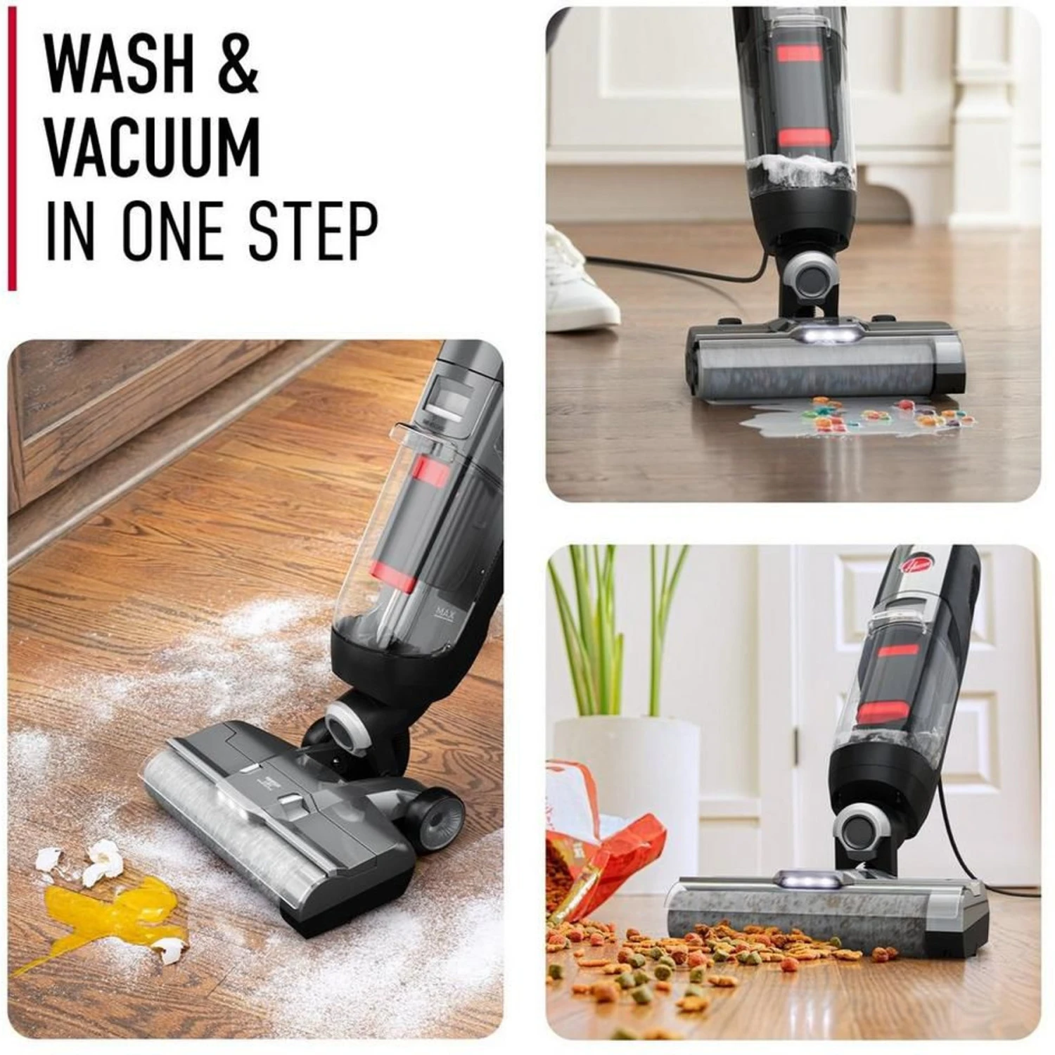 - Vacuums and washes hard floors in one step, eliminating the need for multiple products.