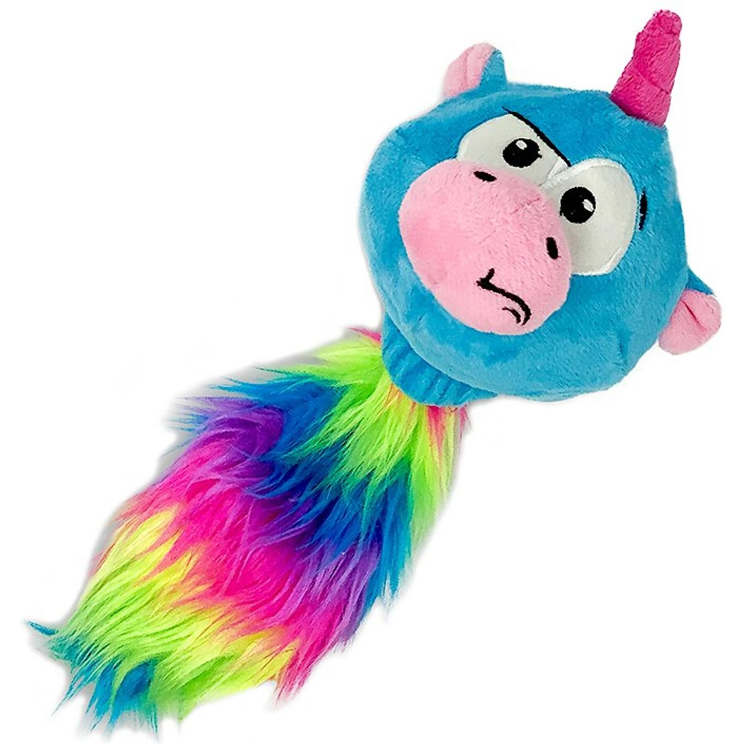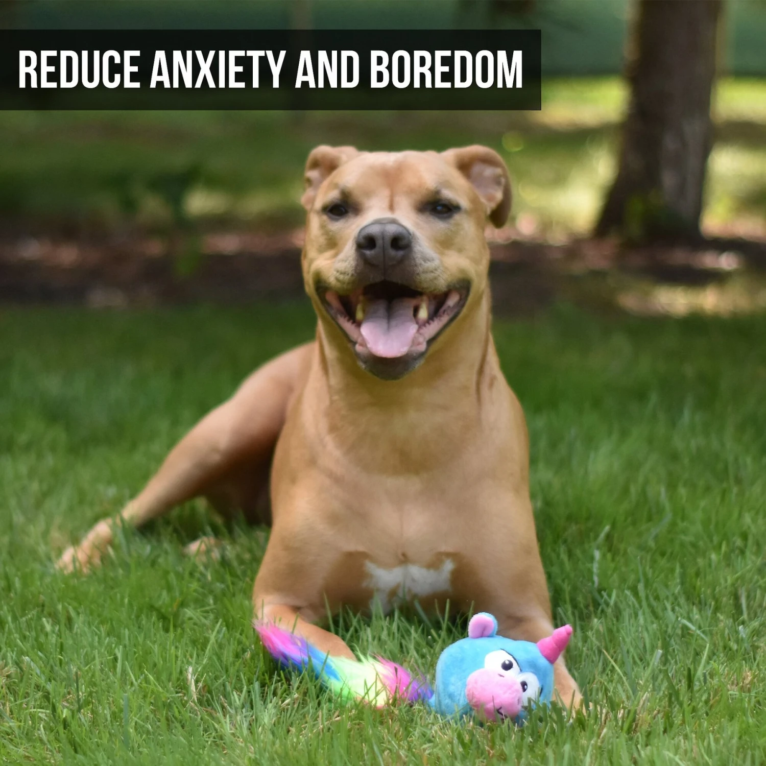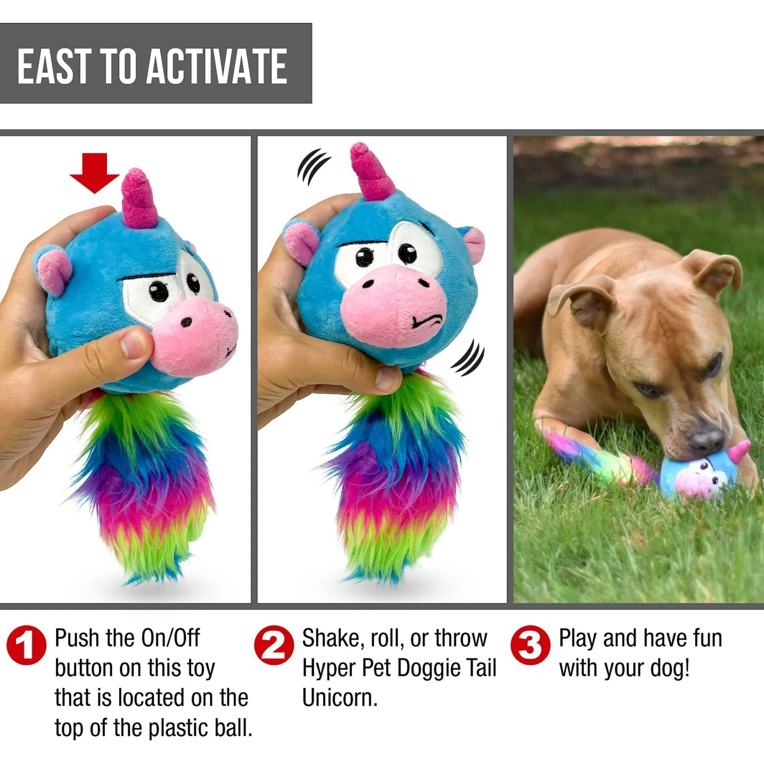 Give your energized pup the playtime of his dreams with Hyper Pet Doggie Pal Unicorn Squeaky Interactive Plush Dog Toy. This interactive, battery-operated toy can actually jump, bark, and wiggle alongside your playful pooch. It is also made with motion activated sensors that help keep your pup playing for hours. To activate this toy, just turn it on using the on/off button at the top of the plastic ball, and throw, shake, or roll the unicorn. Make sure to supervise your dog while he plays.