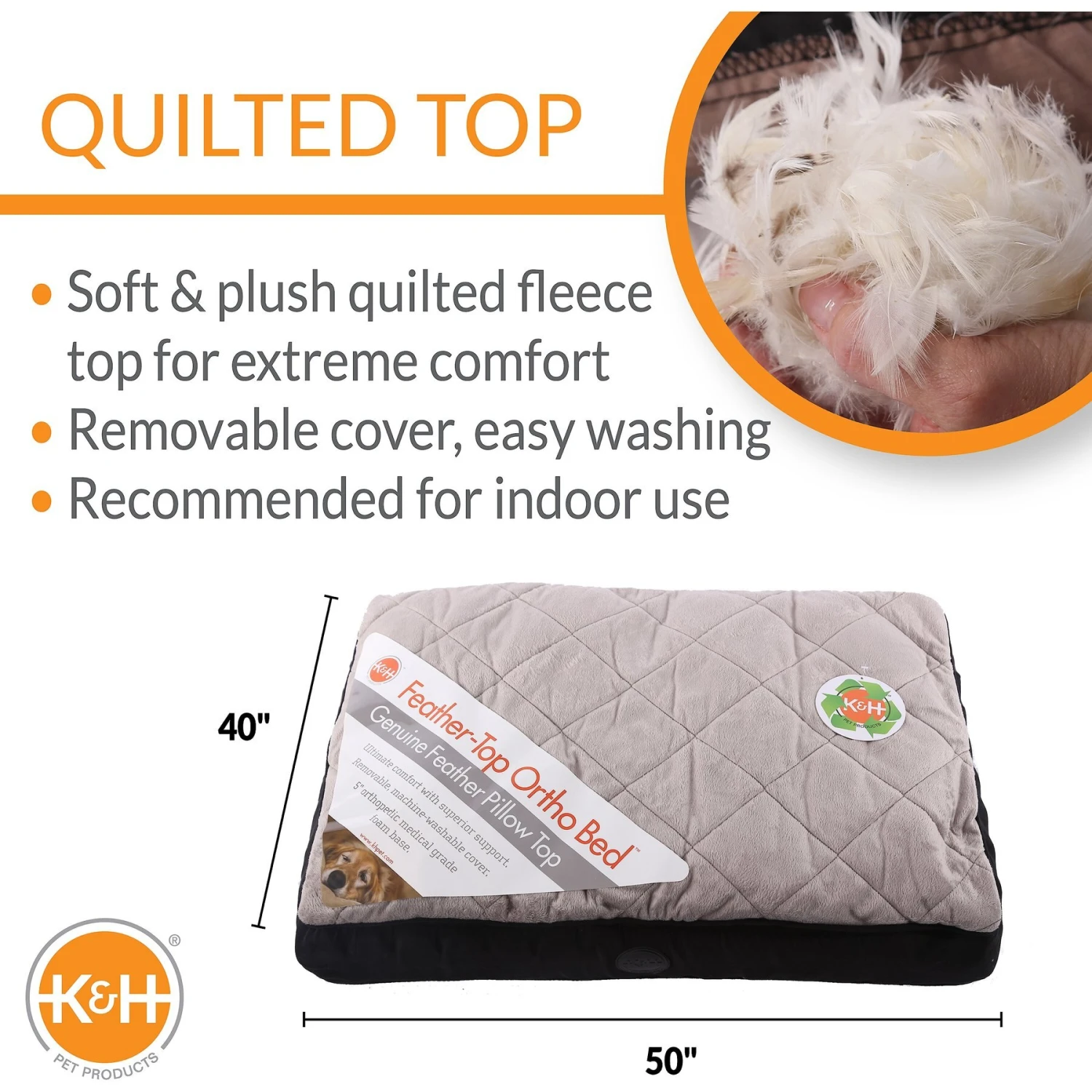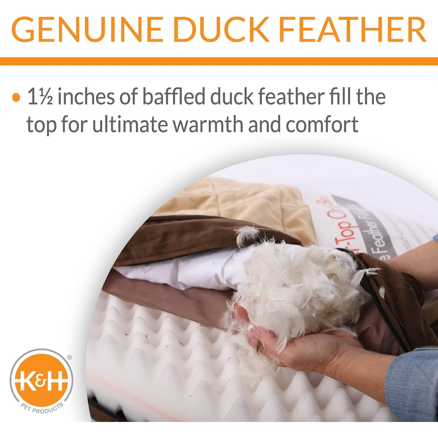 Your pet will sleep soundly on the K&H Pet Products Feather-Top Orthopedic Pet Bed. With a 5 inch medical grade foam base and a 1.5 inch baffled duck feather top complimented with micro-suede, this bed provides a deeper and more restful nightโs sleep by gently cushioning your furry friendโs pressure points like his hips and shoulders. Between the cushioned sleeping surface and the comfort of the medical grade foam, your furbaby will be sleeping in luxury. Plus, the cover is removable making washing a breezeโjust throw into the machine on a cold, gentle cycle.