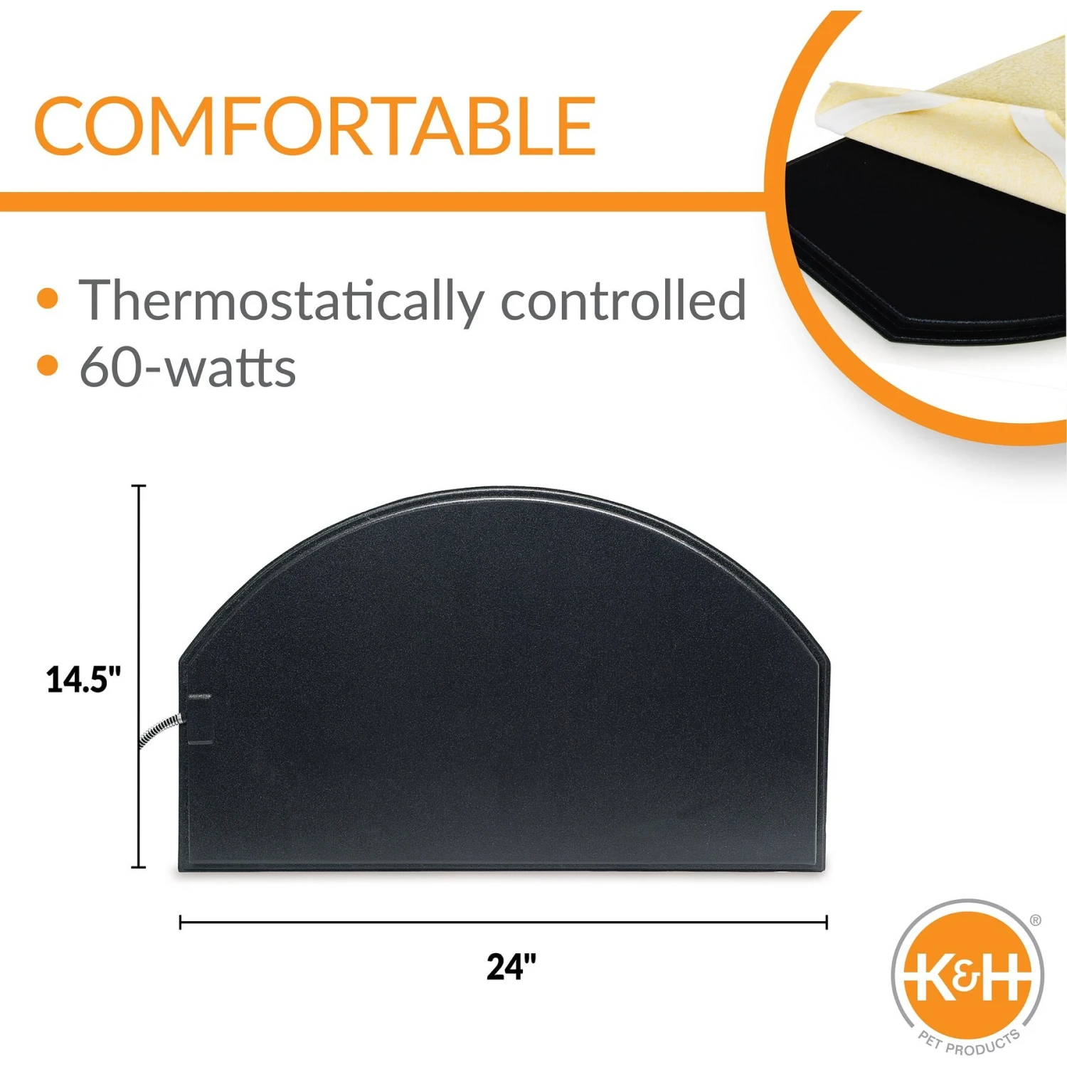 Warm up your dogโs igloo-style doghouse with K&H Pet Products Igloo-Style Heated Pad & Cover. This outdoor heated pad has a half-round shape that fits easily through the door of most round or dome-shaped doghouses (sold separately). Its special shape allows your dog to choose to stay on or off the heated surface, providing comfortable warmth as needed. The heated dog pad can be used indoors or outdoors and it is certified by Met Labs to exceed US/CA electrical safety standards. Use it to make your best friendโs igloo a toasty and welcoming retreat!