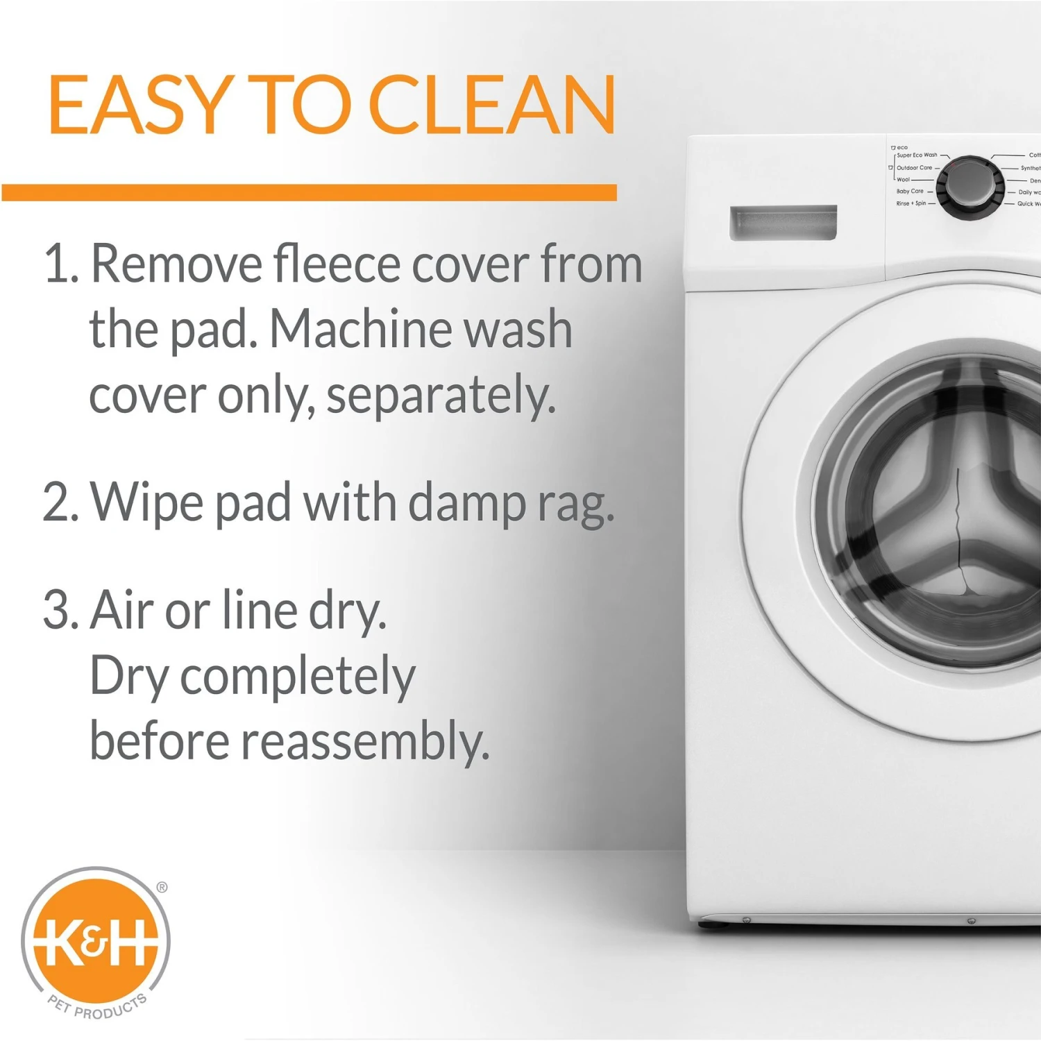 - To clean, wash the faux fleece cover on the gentle cycle with cold water, then line dry. The heated pad can be cleaned using a damp towel or sponge and mild dish washing detergent. Do not wash in a washing machine.