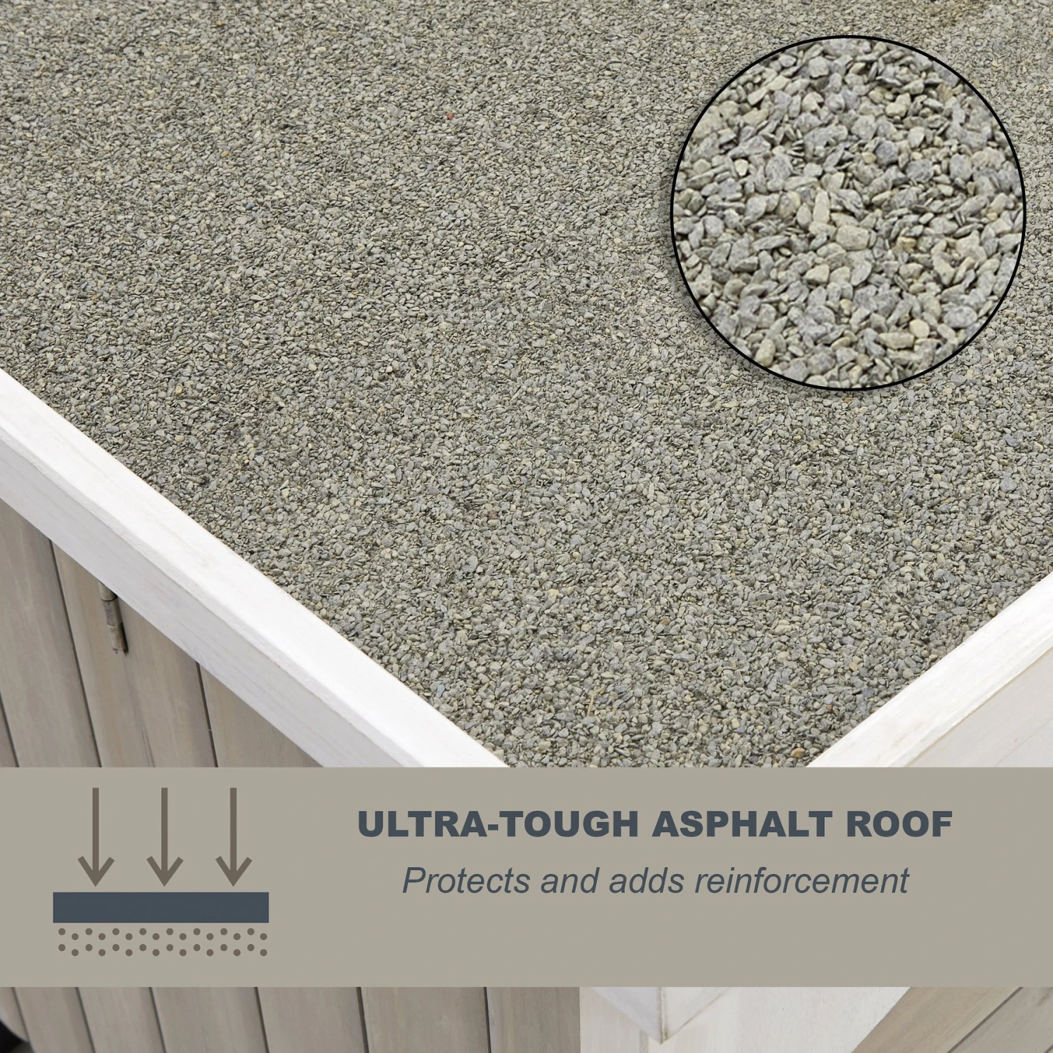 - Made with high-quality components — water-resistant stained wood, stainless-steel hardware and asphalt-shingled roof.