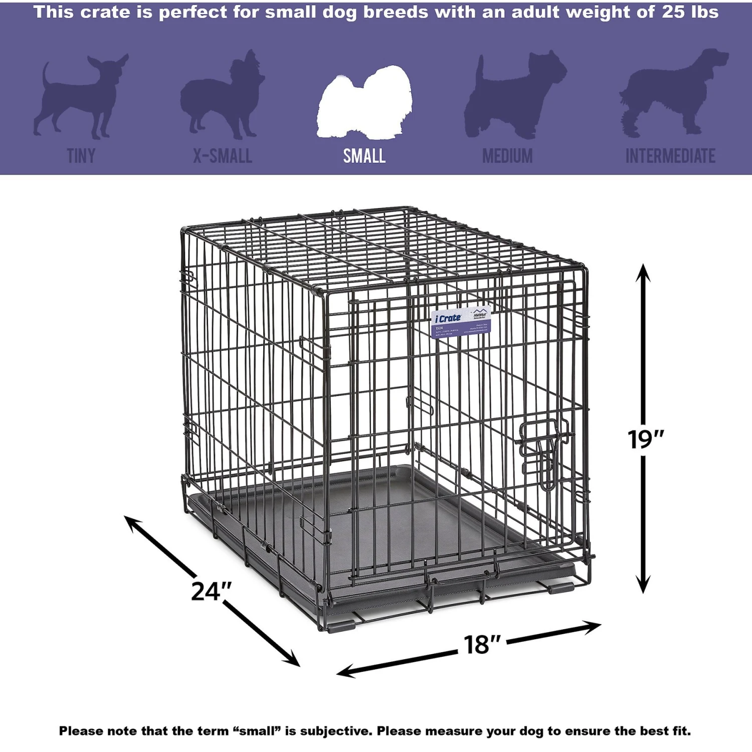 The MidWest iCrate Fold & Carry Single Door Collapsible Wire Dog Crate is the paw-fect space for your furry friend, from puppy to adulthood. Thanks to the divider panel, you can adjust the size of the living area as your puppy grows. And since accidents happen, this crate is designed with a plastic leak-proof pan, which allows for hassle-free cleanup every single time! For added security and safety, this crate now has locking tips on the slide-bolt latch(es) to securely lock the door and patented Paw Block. The Paw Block keeps your canine companion from tampering with the door lock from the inside of the crate. The patented rounded side clips protect your buddy from sharp corners, while the rubber feet on the bottom of the crate protect your floors from scratches. Best of all, this crate is paw-fect for travel because it conveniently folds down flat and has a strong, plastic carrying handle for convenient portability! Assembly and safety instructions are included with every purchase to make setup a breeze. For the best fit, check the measurements of the dog crate and select a size that will be suitable for your furry friend’s adult weight and measurements. When in doubt, size up to ensure your dog has paw-lenty of room!