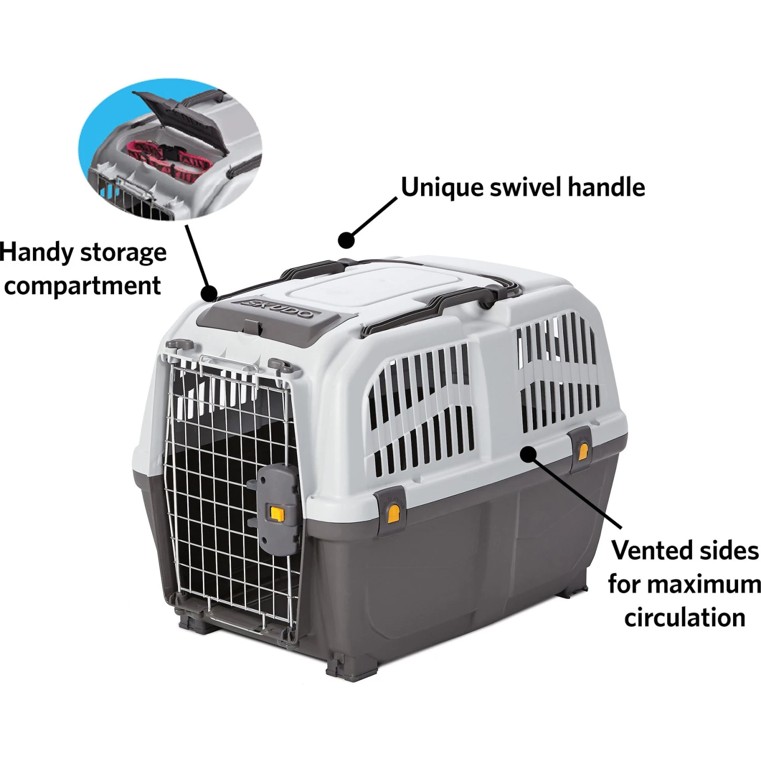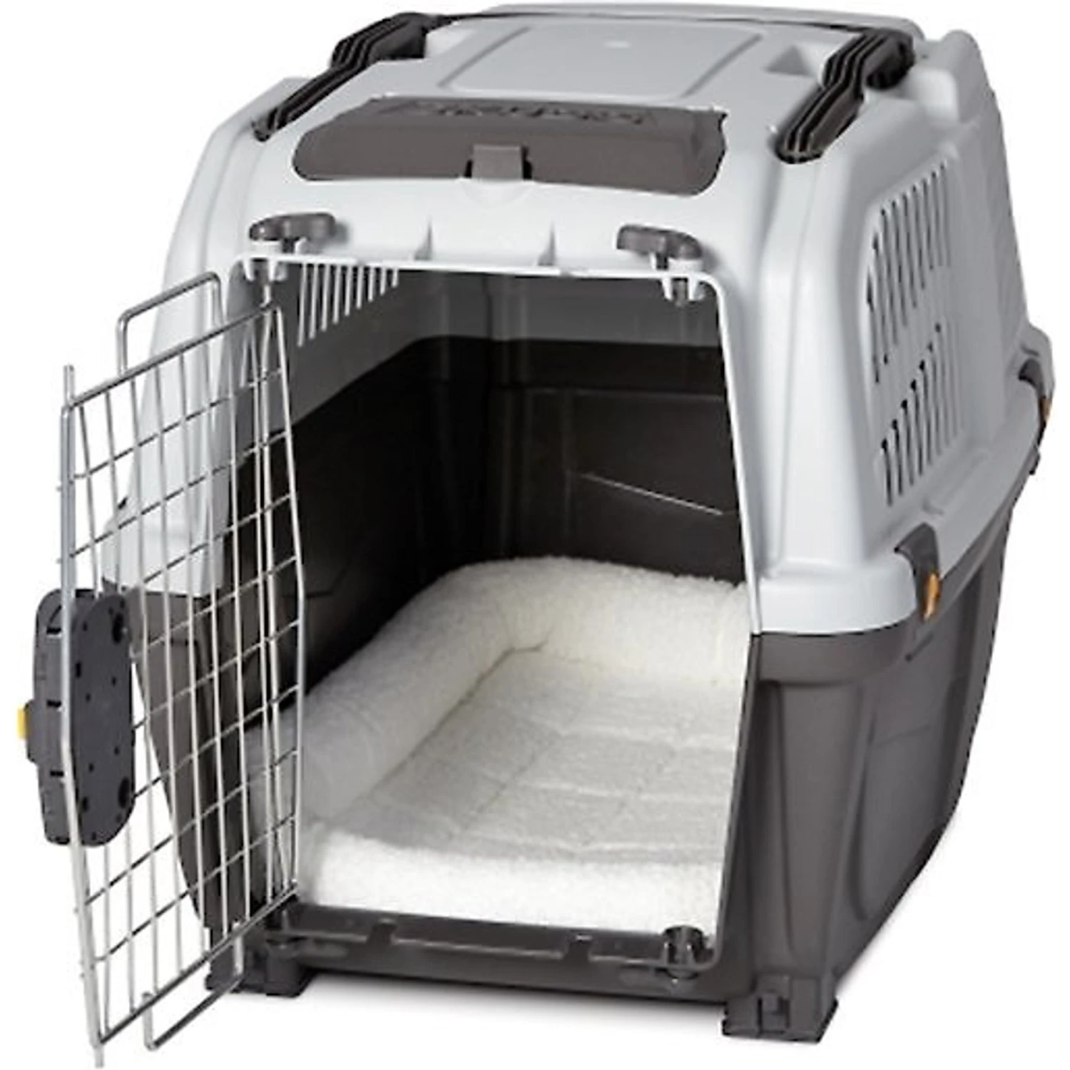 Take your pal anywhere comfortably and securely with the MidWest Skudo Deluxe Plastic Pet Carrier. Made of sturdy and durable plastic, it’s rugged enough for any terrain or ride, whether it’s going on a road trip or just getting to the vet. There’s plenty of space for a dog, cat or small furry buddy, and lots of slots throughout for more air ventilation and temperature control—plus, your fur baby will be able to check out all the views along the way. The carrying handle makes it easy to grab and go, and you can fold it down so you can slide the carrier in the car. You can lock the door with an easy push of a button to keep your pal safely inside. Plus, it’s ready to use from the get go, because it snaps together easily, with no tools needed.