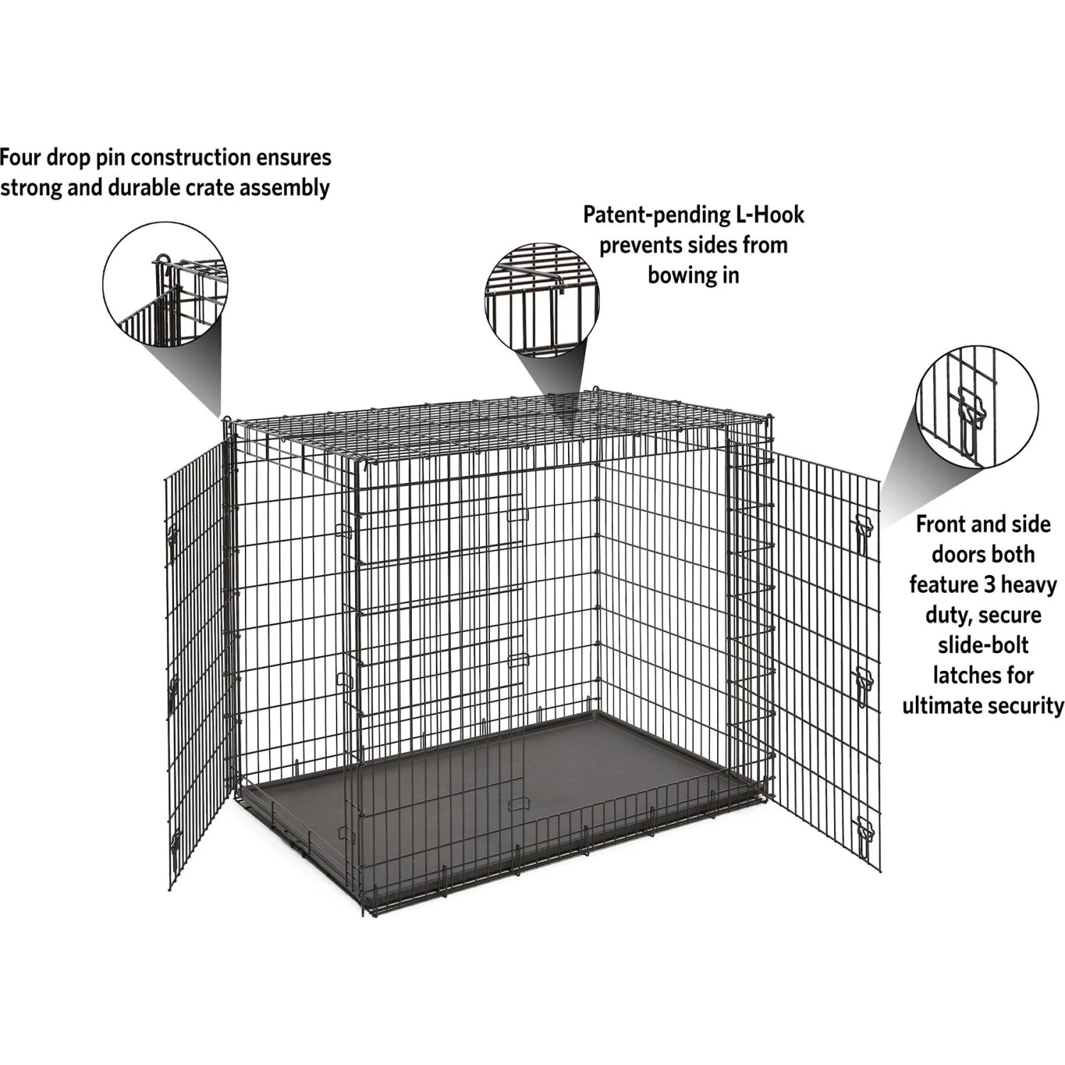 Keep your pal safe and secure with the MidWest Solutions Series XX-Large Heavy-Duty dog crate. Featuring double doors, this XX-large pet crate measures 54 L x 37 W x 45 H and weighs 6.43 pounds, making it great for larger breeds like Great Danes, Mastiffs or St. Bernard’s. Made with a durable, heavy-duty metal, it has two doors for convenient front- and side-door access. Each door includes three secure slide-bolt latches for your palโs safety. It also comes with a tough, easy-to-clean leak-proof plastic pan for those unexpected accidents. The dog crate uses a drop-pin construction ensuring maximum durability and to handle large breed dogs safely and securely. Plus, it comes equipped with a patent-pending “L” bar that horizontally runs along the middle of the top panel to prevent the side panels from bowing inwardly after assembly, this way ensuring a safe and sturdy crate for your dog.