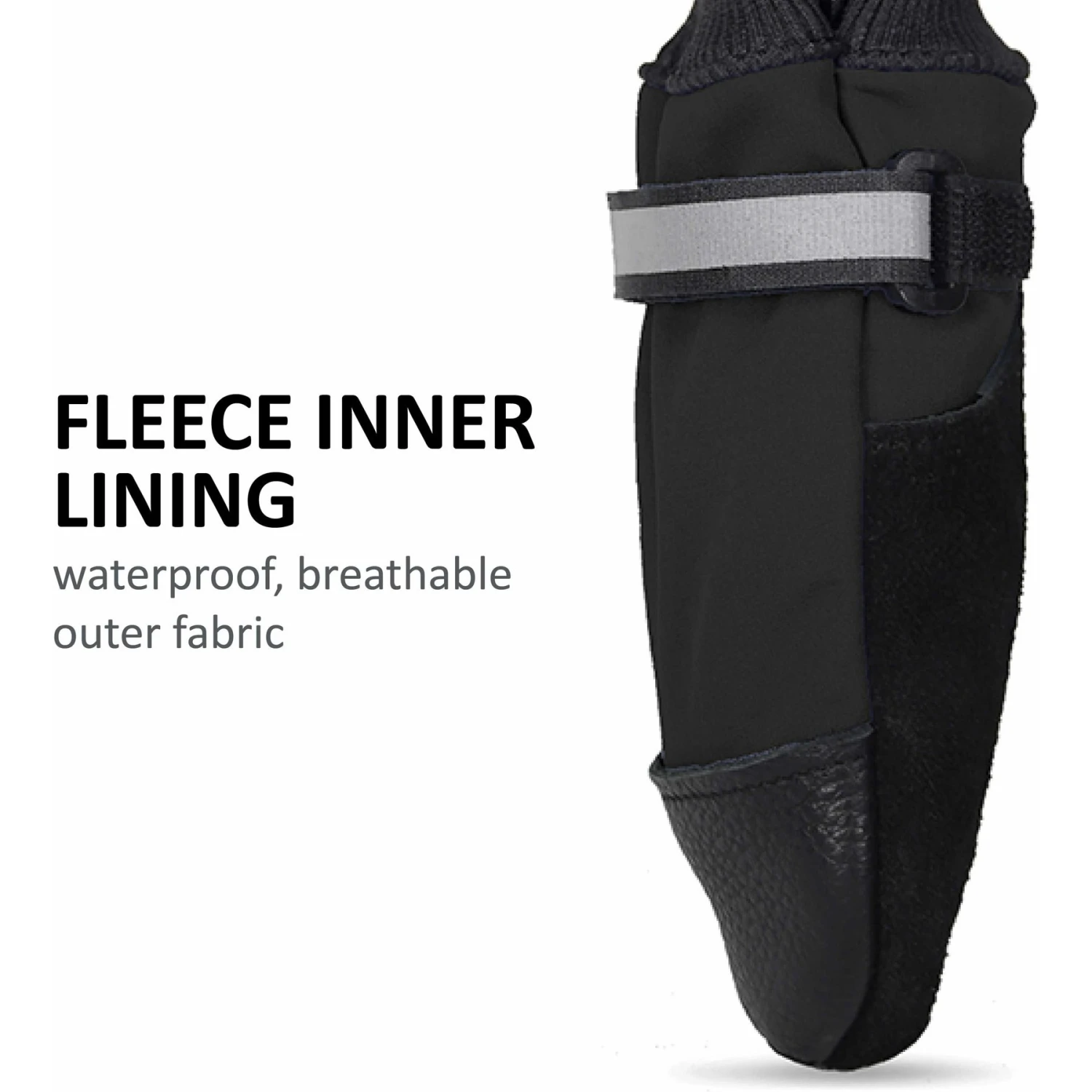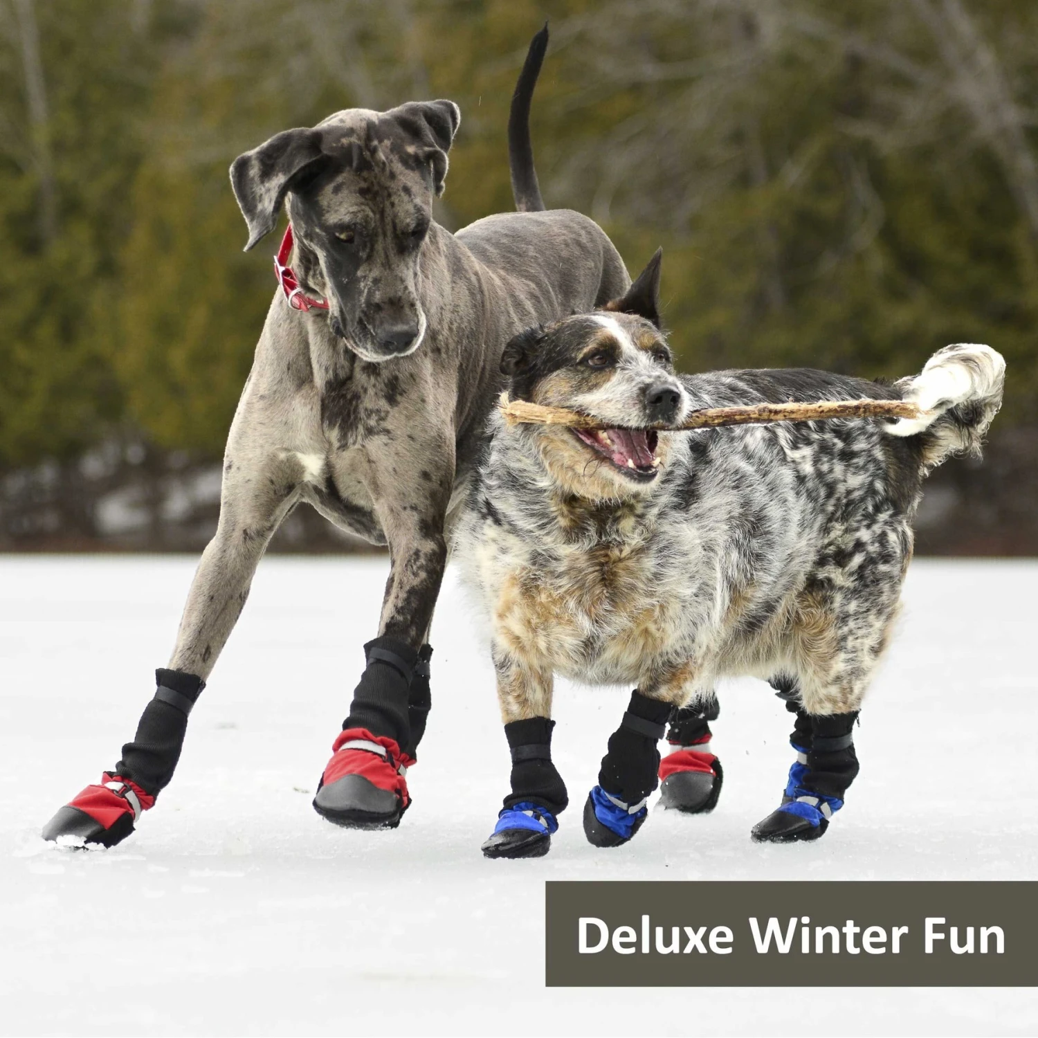 Remember to measure your pet for the paw-fect fit. Say bye-bye to cold, cracked and uncomfortable paws with the Muttluks Deluxe Winter Dog Boots with Waterproof Fabric. These boots are a step above when it comes to performance and convenience, and theyโre an enhanced version of the Original Fleece-Lined Muttluks (sold separately). The long cuff with a fastening strap is paw-some for adventures in deep snowy winter conditions, helping to keep warmth in and snow out. The waterproof, breathable and windproof outer shell fabric and fleece inner lining help to keep the cold out, so your furbaby stays comfy. Flexible soles adapt to paw movement and shape for a barefoot-like feel, so your best friend will be ready for walks, hikes and more no matter the weather.