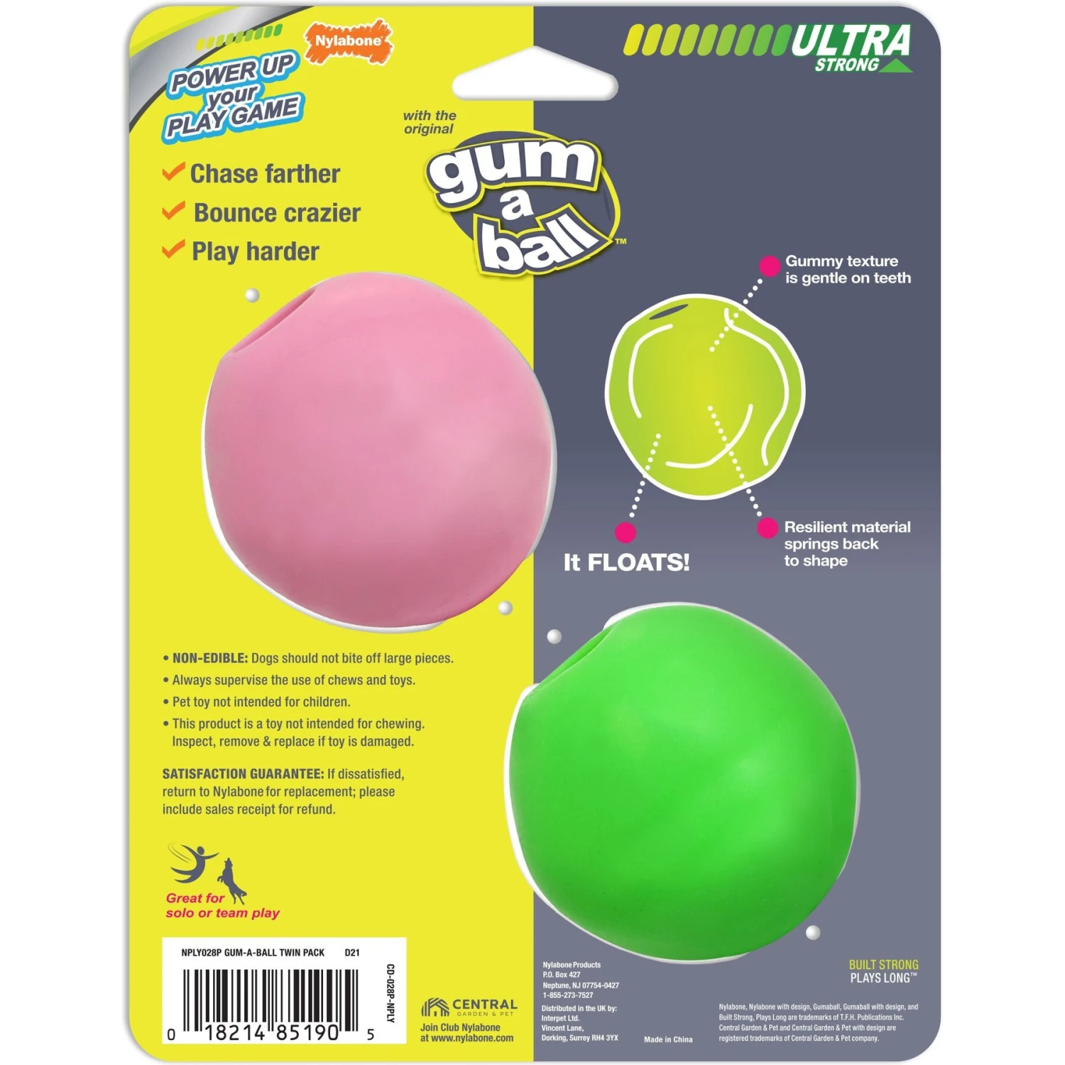 Power up playtime with Nylabone Power Play Gum-a-Ball Dog Toy! This toy is made with durable yet squishy materials, giving it a gummy texture that is gentle on your pupโs teeth. Its innovative design makes it virtually unpoppable, and its erratic bouncing makes it an irresistible addition to a game of fetch. Its bright color makes it highly visible during solo or group play, and it even floats for fun in the water! It is the paw-fect chew toy for gentle chewers or those with sensitive teeth.