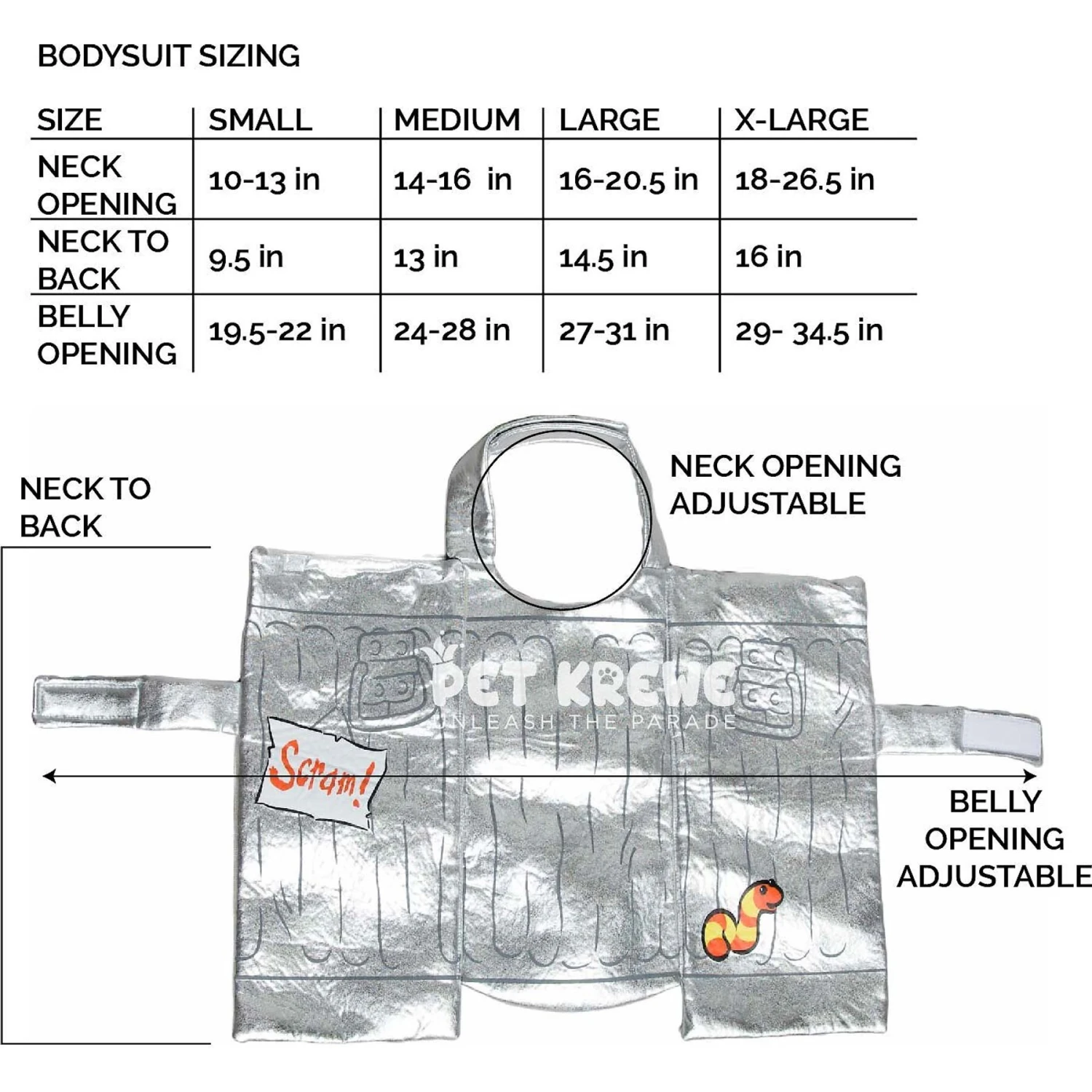 - Fuzzy fasteners on bodysuit make it easy to put on and take off.