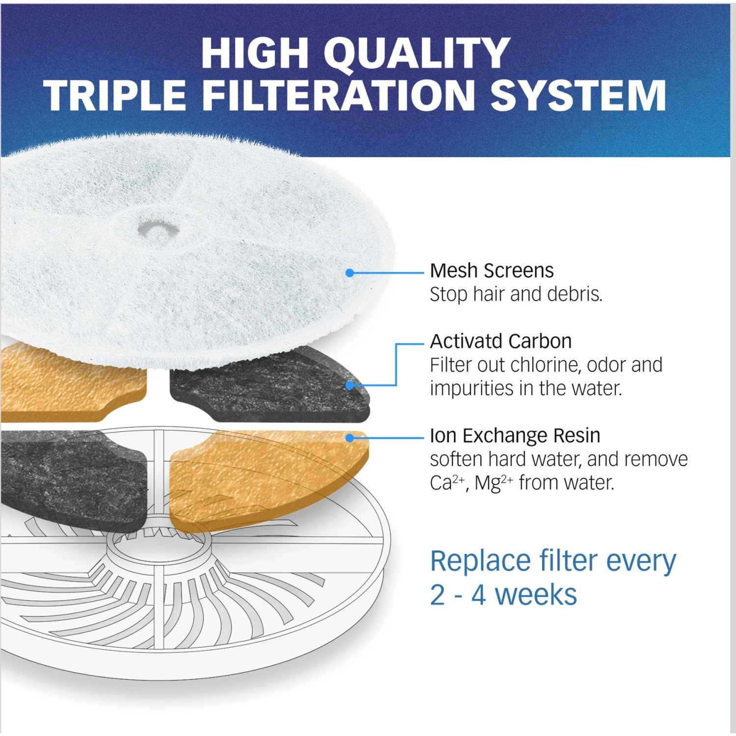 - Pet fountain filter works to effectively remove hair and heavy metals from your pal’s water while keeping it fresh and tasty.
