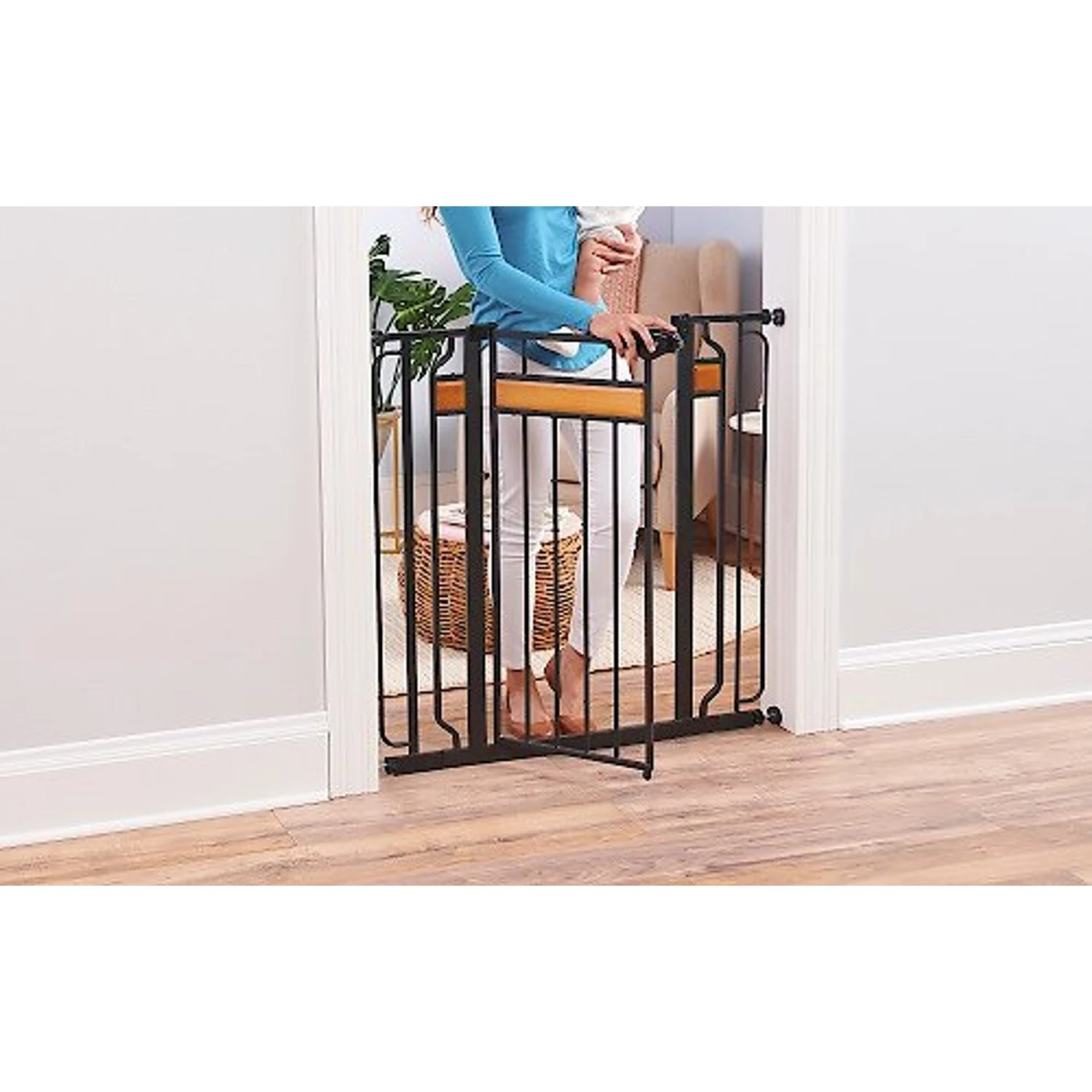 - Pet gate that allows you to keep your furry friend contained or block him from areas of your home.