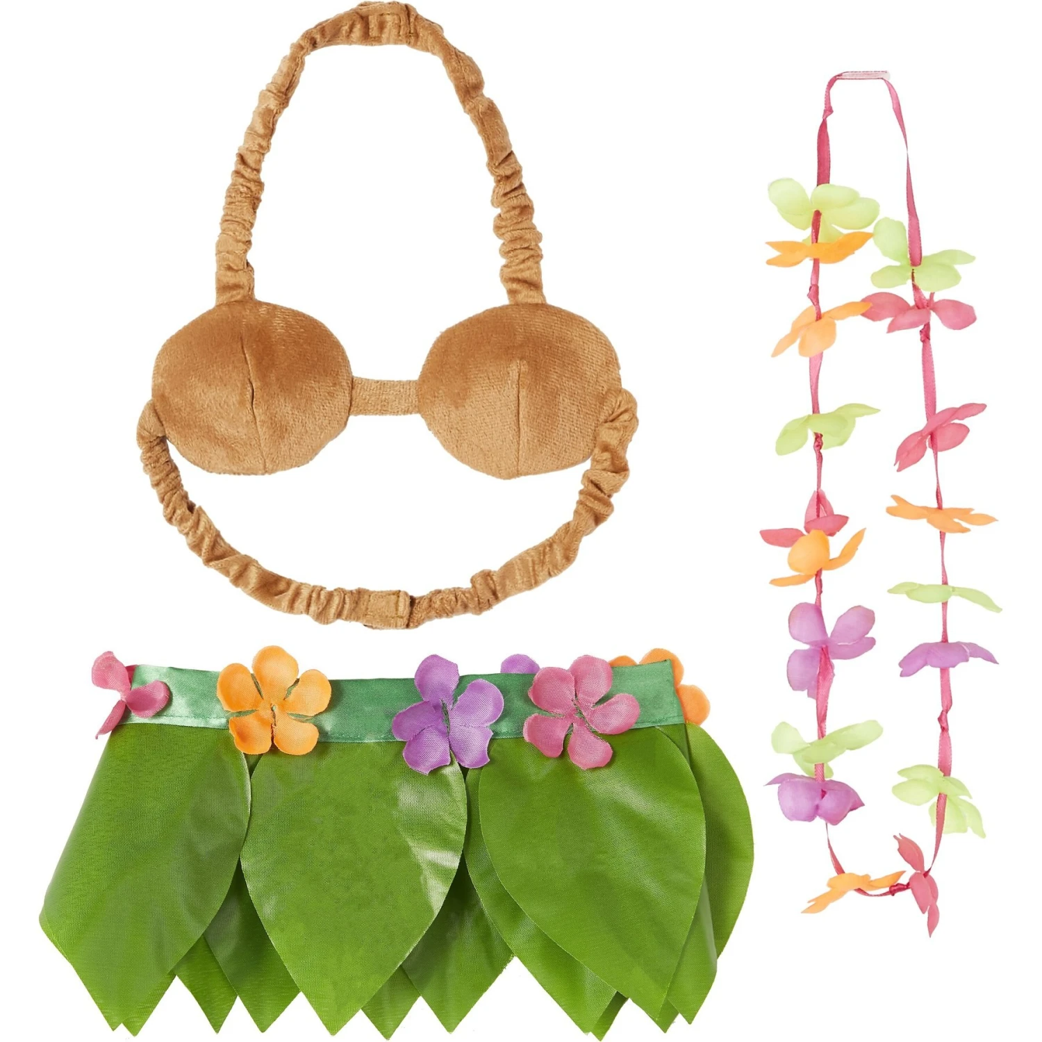 - Features a fleece “coconut” bra, leaf shirt with flower waist and a flower lei for her neck.