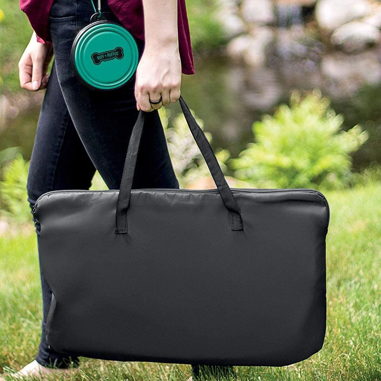 Keep your best fur-iend safe while on-the-go with the Ruff ‘N Ruffus Portable Foldable Cat & Dog Playpen, Carrying Case, & Travel Bowl! This contemporary, portable playpen is made from durable, water-resistant materials. It features a carrying case and a collapsible 16 oz. travel bowl for added convenience. It features a removable zippered roof and door for safety and visibility. It also features a roomy eight-Panel design with protected seams and reinforced corners for added strength and durability. When not in use, it folds up to a small, lightweight package that can easily be transported or stored away. If youโre looking for style and functionality, then this is the paw-fect playpen to jet-set around the world with your furbaby!