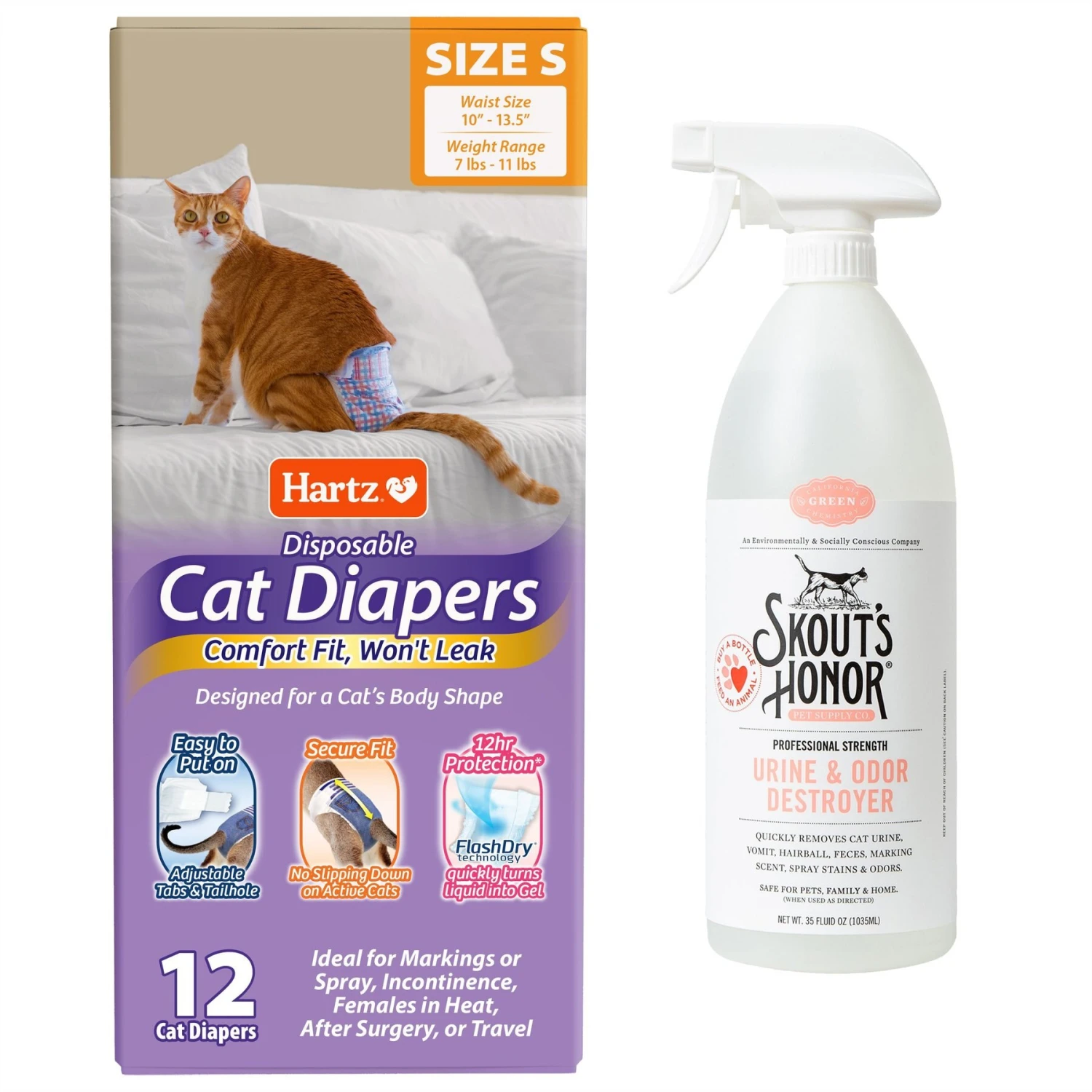 Hartz Disposable Cat Diaper, 12 count, SmallโWhen your feline friend needs backup, you can count on a Hartz Disposable Cat Diaper. Designed specifically to fit a catโs unique body shape, these breathable diapers are easy to put on, with wide, adjustable tabs, soft and stretchy gathers and an adjustable tailhole. Your kitty can feel comfortable with a secure fit that wonโt slip or bunch. A super-absorbent core material instantly turns liquid into gel, for up to 12 hours of leak-proof protection. Gentle on your catโs skin while wicking away moisture to keep him dry, these diapers can be worn by both male and female cats. Theyโre a purr-fect solution when your kitty is in heat or when you are traveling!