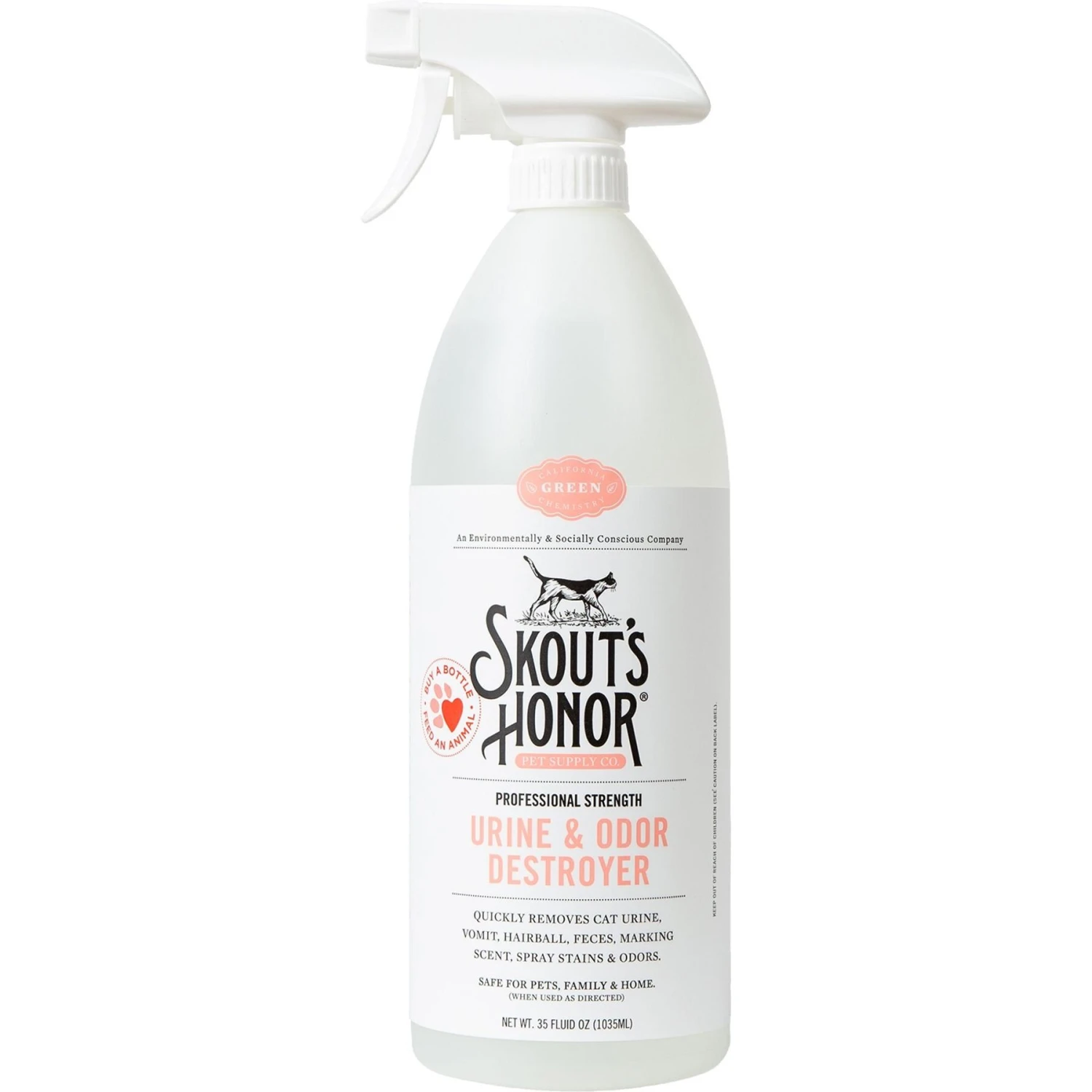 Skout’s Honor Professional Strength Cat Urine & Odor Destroyer, 35-oz bottleโKeep your home clean with Skout’s Honor Professional Strength Urine & Odor Destroyer. This hard-working spray performs fast to break down and eliminate both old and new pet urine stains and odors at the molecular level. This eco-friendly spray is safe for use on rugs, carpets, upholstery and clothing for a versatile but strong cleanser. The BioKore technology breaks down the stain, while the odor-eliminating technology destroys those pungent molecules for a fresh clean scent. Together, these solutions will keep your home unstained and ready for the next slip-up whether itโs urine, vomit, hairball, feces or marking scents.
