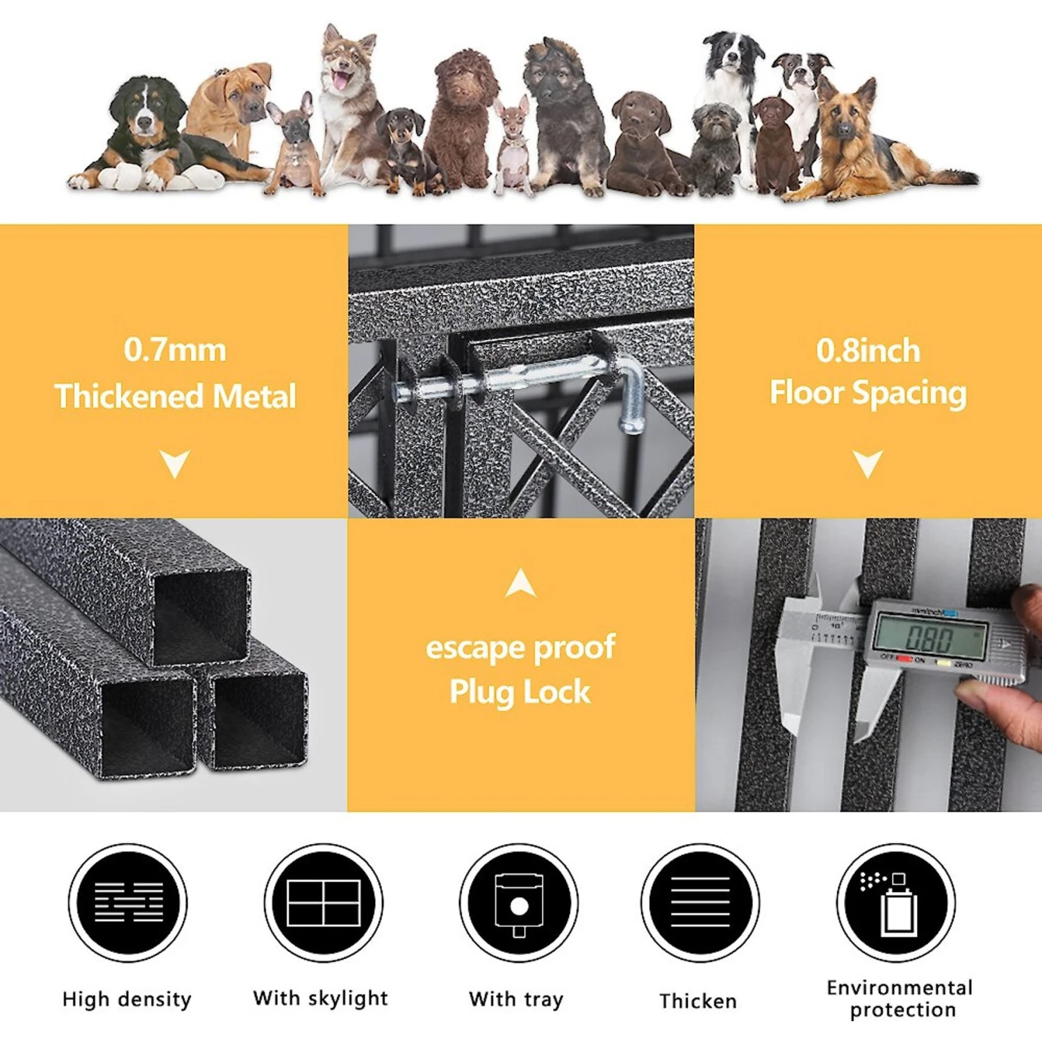 Every dog deserves a safe, cozy place to call his own, so give your fur baby his own little space with a SMONTER Heavy Duty Double Lock Metal Large Breed Dog Crate. Welded with durable steel bars with a nontoxic finish, this crate has a unique Y-shaped design and rounded edges that keep your household safe from sharp corners and your pup safe if he gnaws and bites the frame. Featuring a double lock with safety latches, this comfortable crate keeps your pal safely and securely contained. The spacious double doors make entry, feeding, and petting simple as well. Plus, the removable, washable plastic tray on the bottom collects fallen food and any potential โaccidents,โ meaning you can easily keep your pupโs humble abode clean. Its portable tooโfour lockable wheels makes transporting this crate simple. Itโs the paw-fect home for larger dogs.