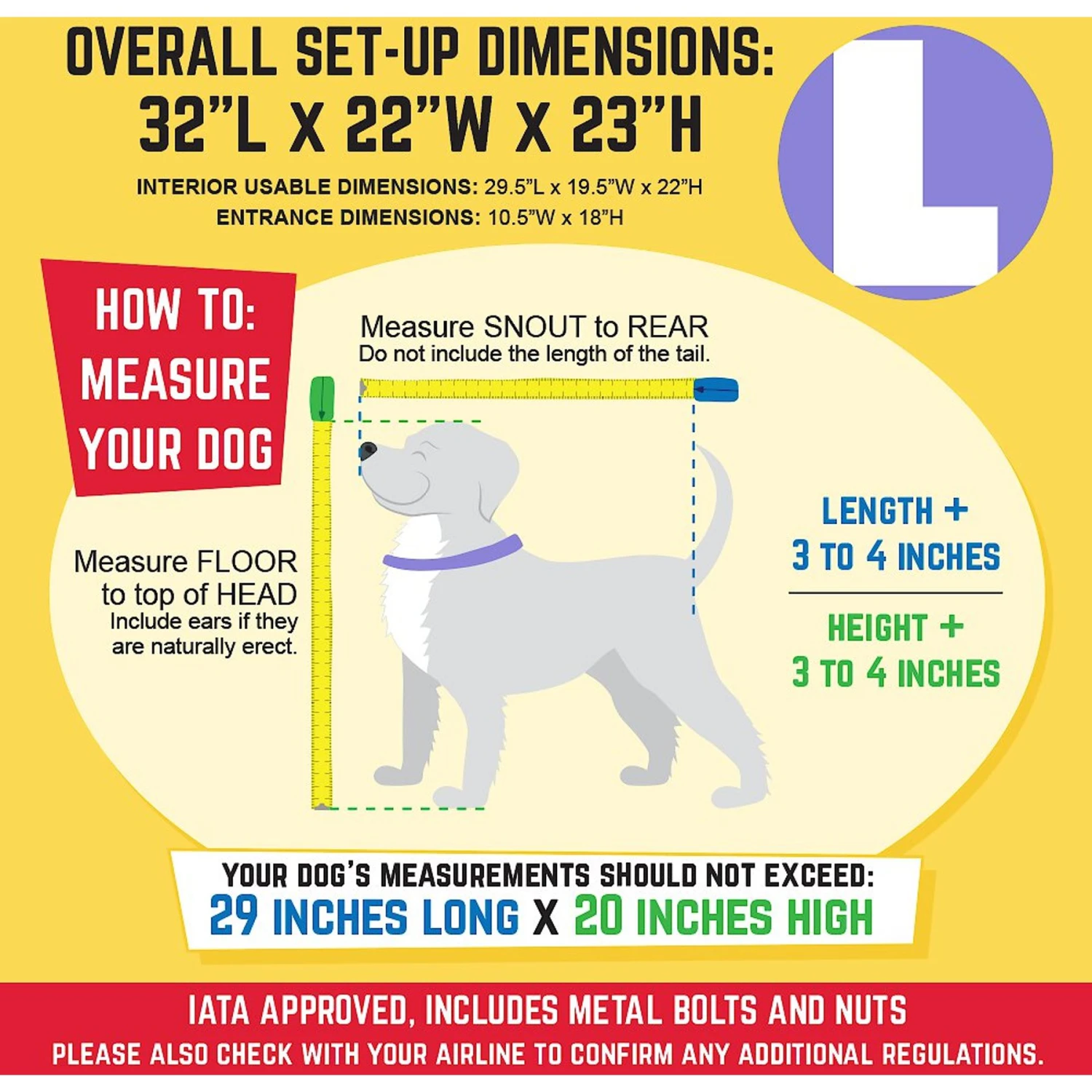 - IATA airline approved. Includes 2 dishes, 4 live animal stickers, metal bolts and nuts, and tie down holes for bungees required by airlines.