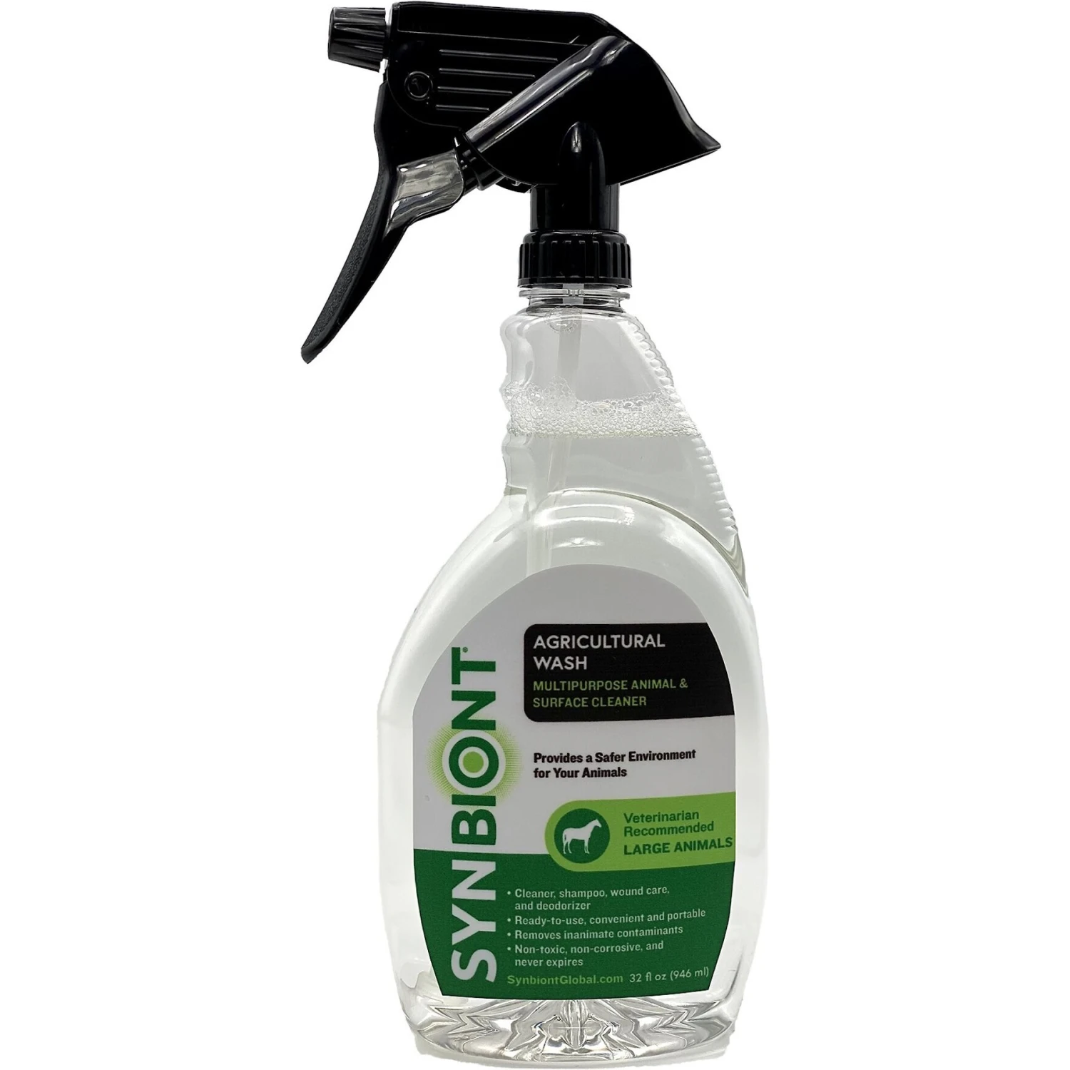 Synbiont Agricultural Wash Ready to Use Pet Cleaner comes ready to use (no mixing required) in a spray bottle and can be used on your pets and their surroundings. Originally developed and patented to clean fruits and veggies, this cleaner is safe, non-toxic, food-grade safe, eco-friendly, biodegradable and 100% free from dyes and fragrances. This cleaner is also veterinarian approved, which means, it can be used as a shampoo for your pet! While gentle for pets, itโs also tough on insects and can be used to clean and deodorize your furry friendโs living area, stalls, beds, bowls, tack, toys, cages and more. Best of all, there is no expiration date, so you can use this cleaner for years, until it runs out!