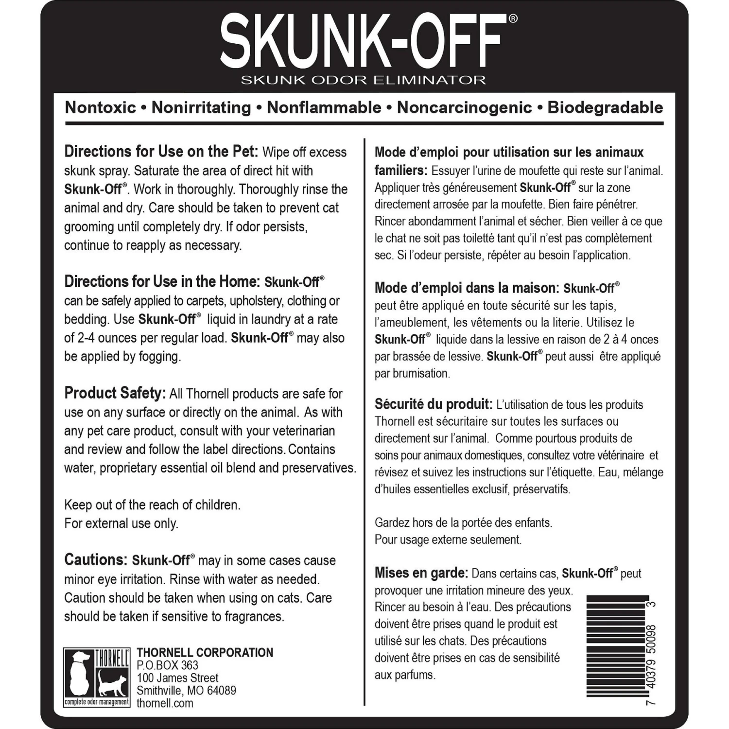 Skunk-Off may in some cases cause minor eye irritation. Rinse with water as needed. Caution should be taken when using on cats. Be sure to thoroughly rinse if using Skunk-Off on cats. Cats are natural groomers they continually lick their hair coat. Skunk-Off in the cat’s mouth is not dangerous but it may cause excessive drooling.