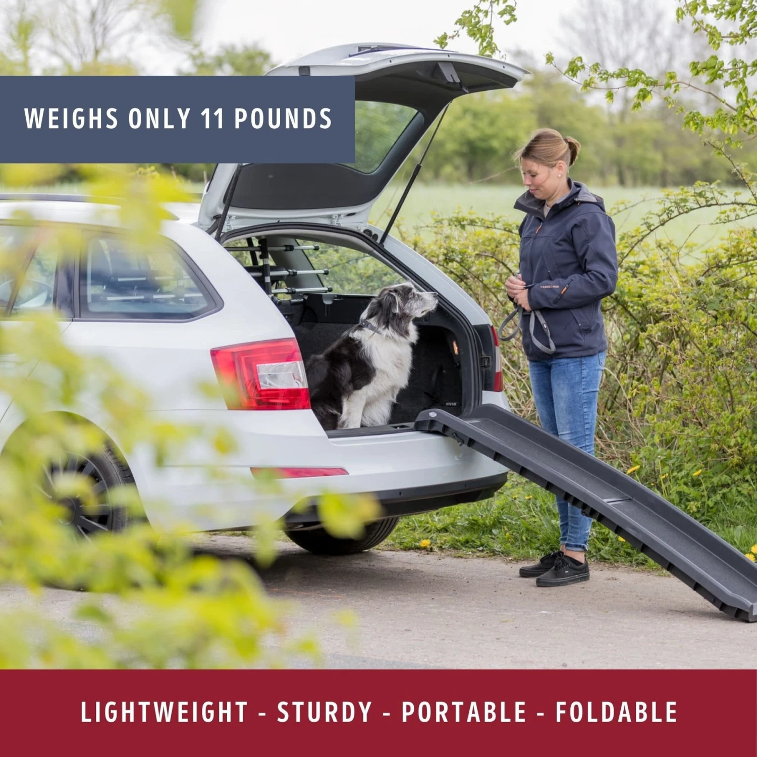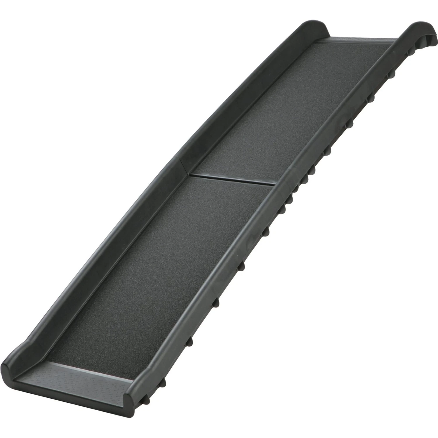 Your furry friend can reach new heights with a little help from the Trixie Two-Fold Dog Ramp. This foldable, lightweight ramp is made to be collapsible so you can easily store and transport it without breaking a sweat! The durable plastic design is finished in a non-slip coating and features protective side rails so your best bud is kept secure with every step he takes. Non-skid rubber feet keep the ramp in-place when in use while the washable material makes cleaning a breeze. Your pet who suffers from arthritis, sore joints or stiff muscles will love the freedom this two-fold ramp provides!
