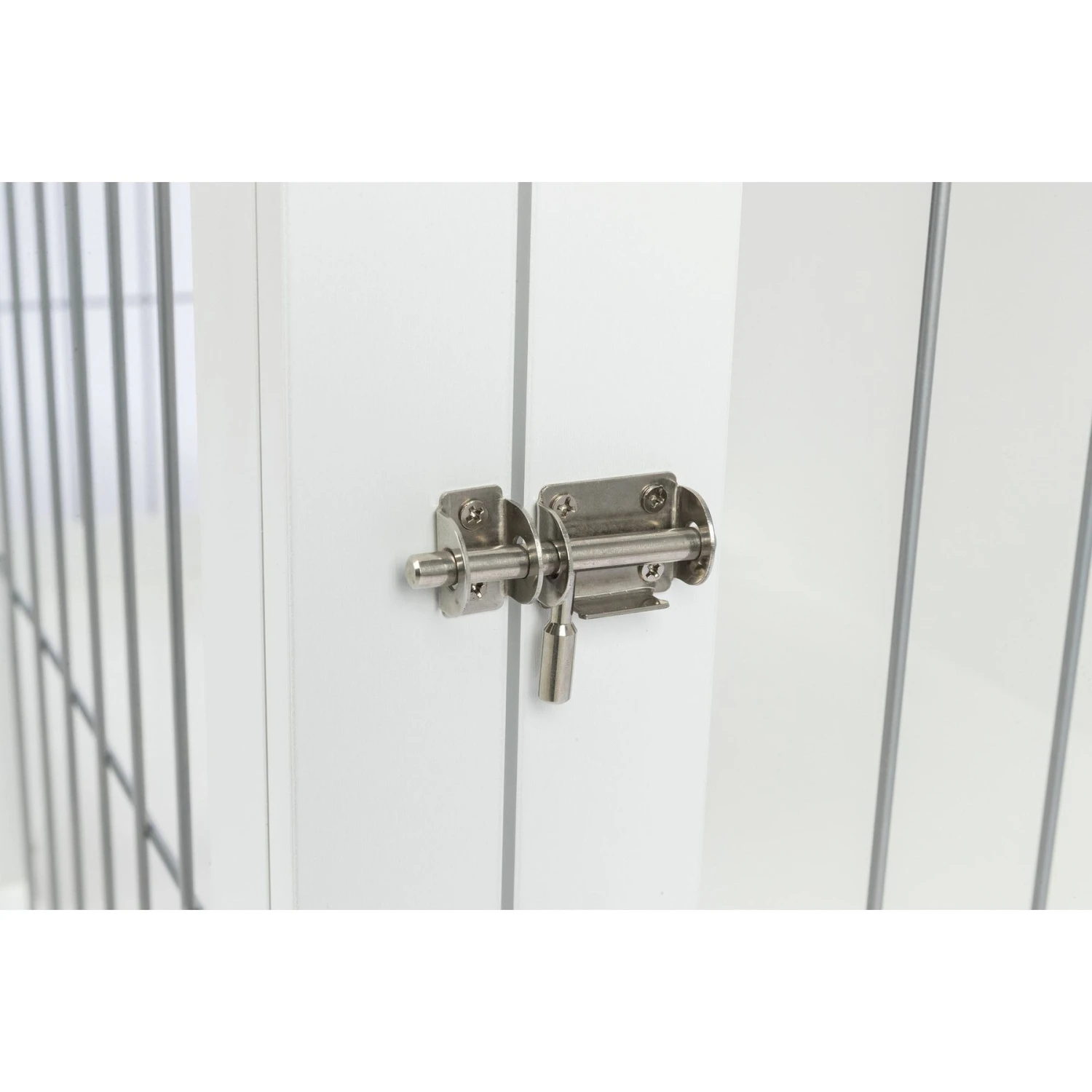 Give your pet a stylish place to rest with the TRIXIE Wood & Wire Furniture Side Table Pet Crate. This combination pet crate and side table is a great way to conserve space while accenting your home decor. Combining function and style, the wood and wire design complements a variety decor styles and provides visibility, so you can easily keep an eye on your pet. Lockable openings on the front and side let you position the crate in the way that suits your needs best, while the back panel is solid to help your pet feel more secure. The moisture-resistant floor helps protect the floor in your home, from accidents and messes, too. Your dog will love this crate-side table and so will you!